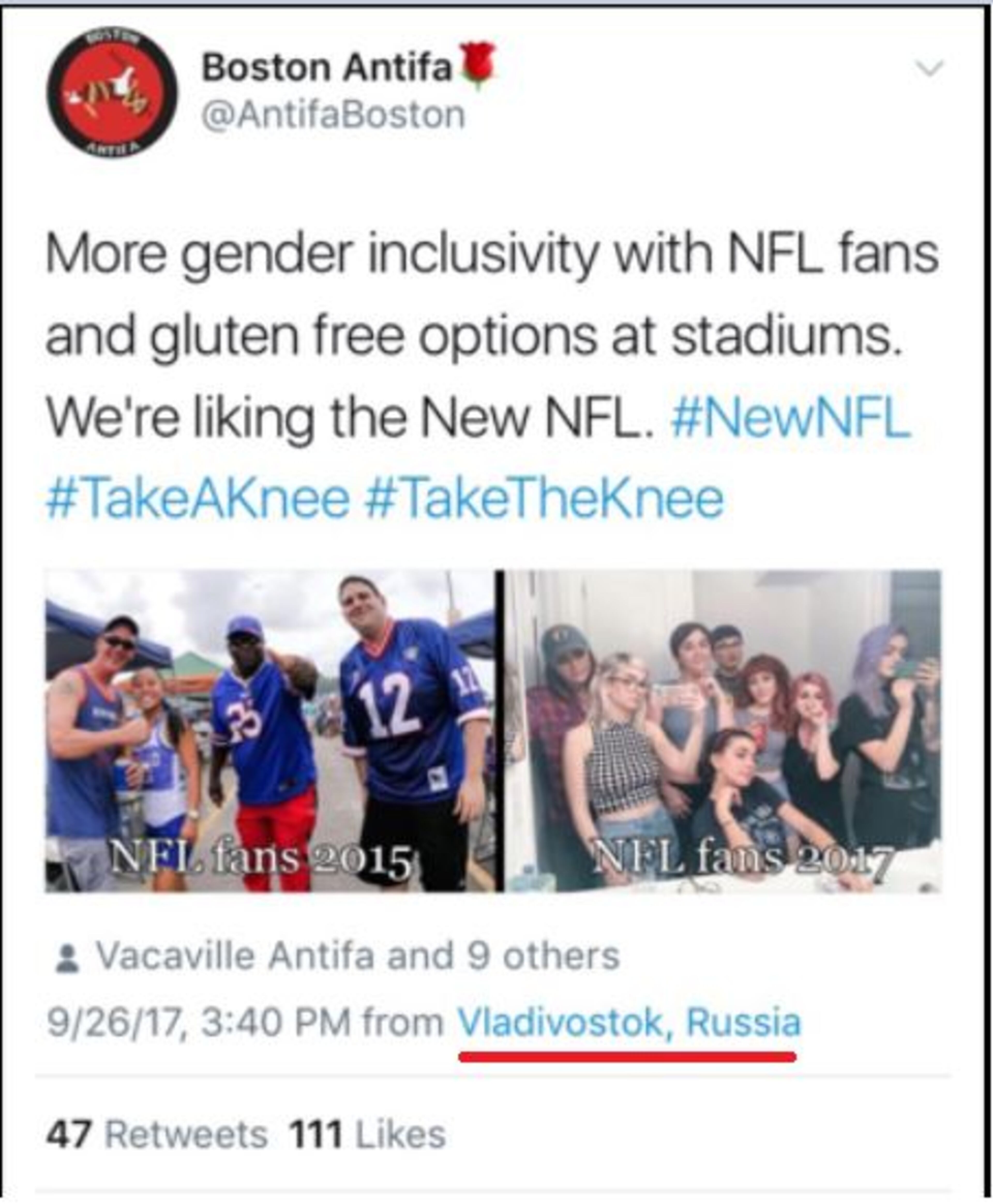 Lankford's office highlighted a tweet from an account that is labeled "AntifaBoston" - which was sending out messages of support for players taking a knee during the National Anthem, saying it "has a large probability" of being part of a Russian trolling effort.