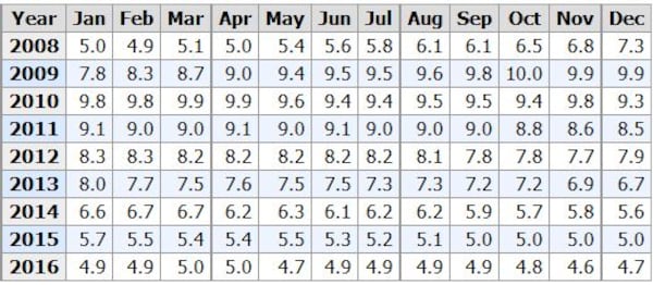 1. The headline number on unemployment is better for Obama. If you just check the jobless rate, that has improved under President Obama's time in office. When he took the oath of office in January of 2009, the unemployment rate was going up, as the economy was shedding thousands upon thousands of jobs; eight years ago, the December 2008 unemployment numbers was at 7.3%. The jobless rate peaked at 10 percent in October of 2009, and ended at 4.7 percent in December 2016.