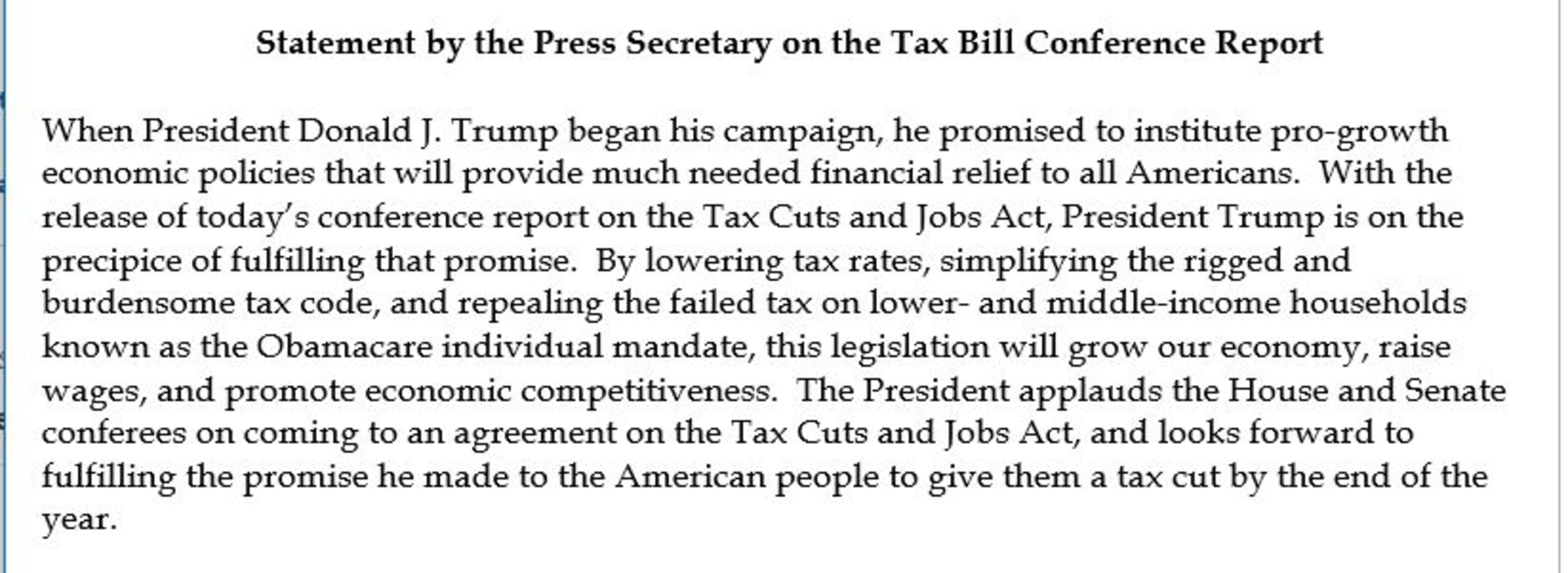 9:05 pm - As of this moment, the President has not tweeted specifically about the final agreement on the tax bill. The White House did put out this statement.