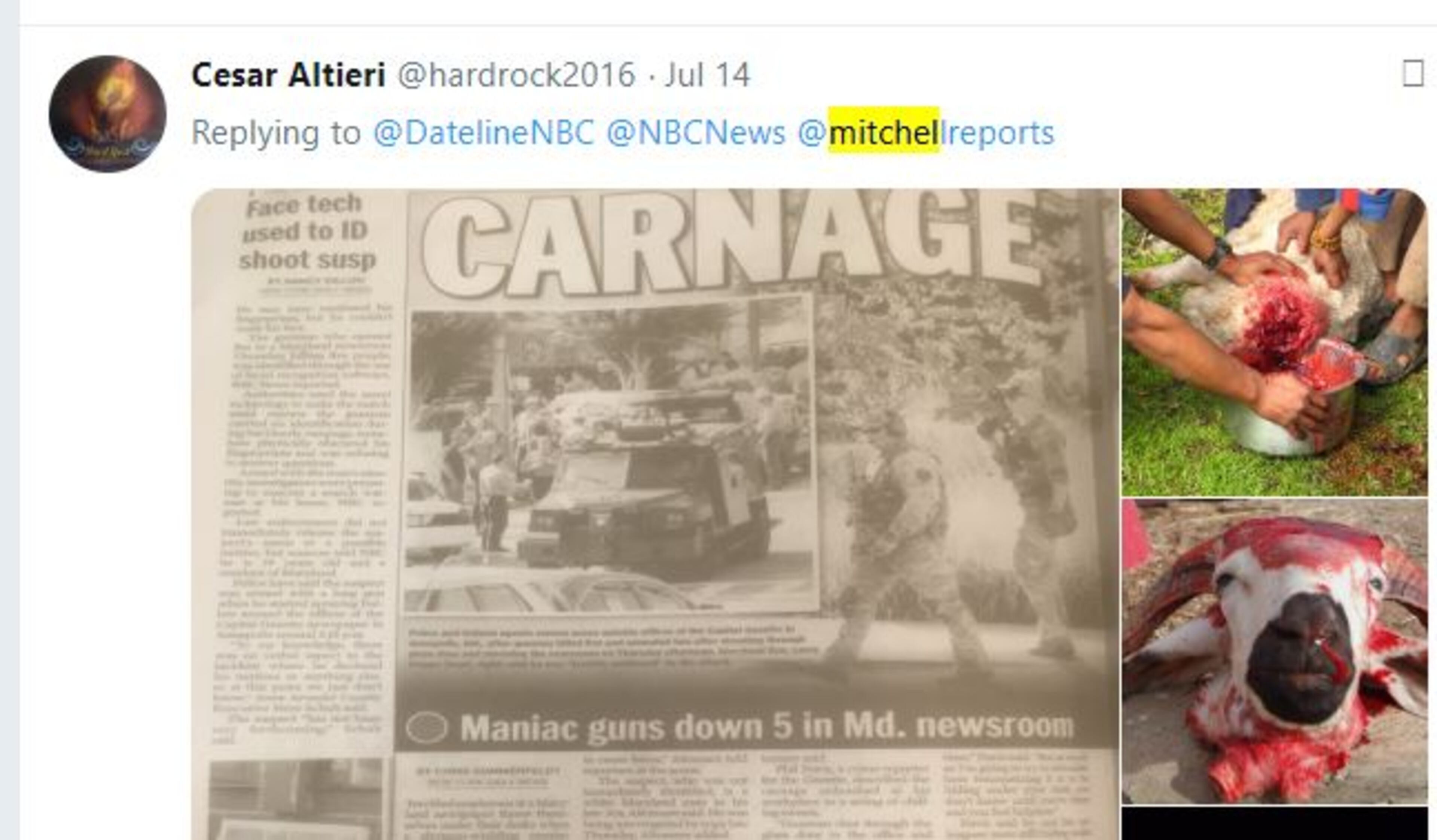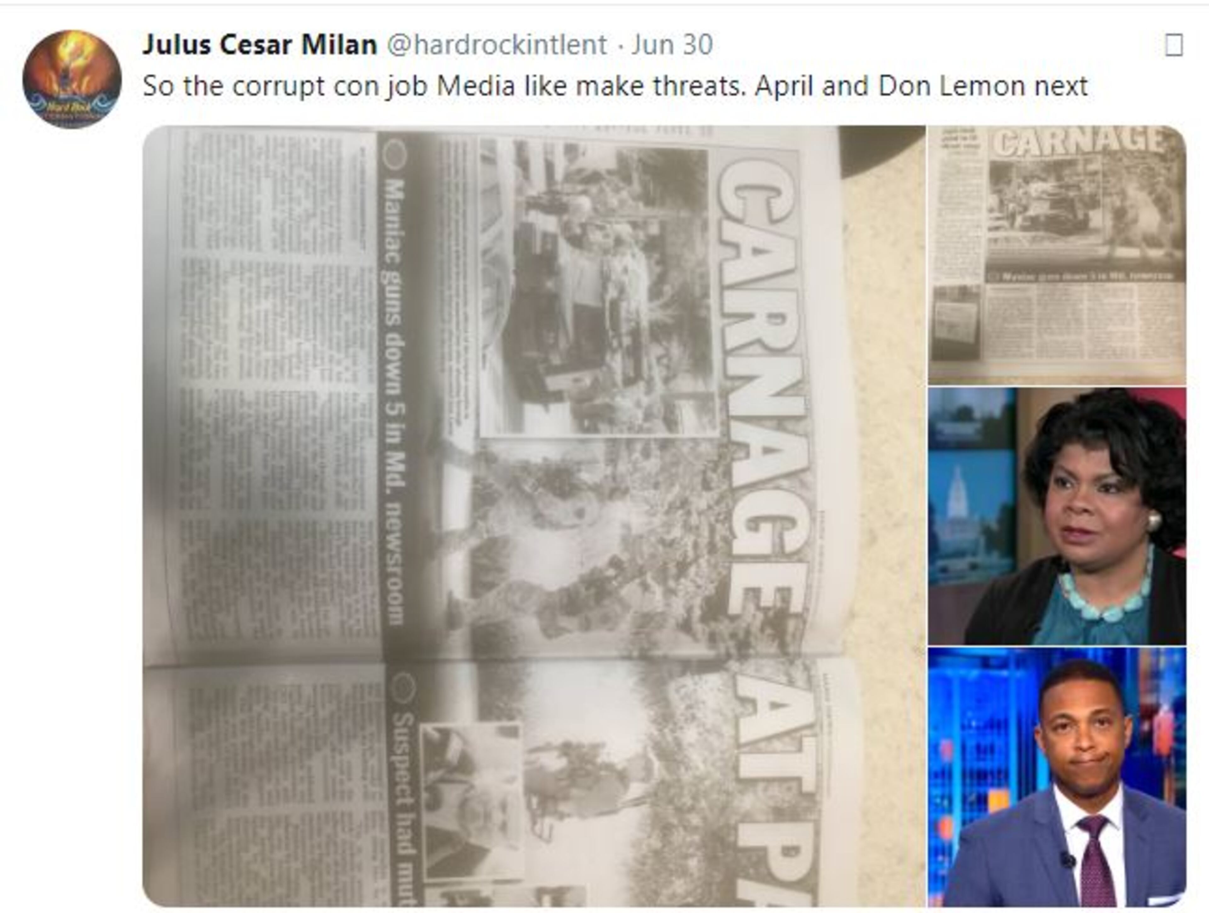 + White House reporter April Ryan, and CNN anchor Don Lemon, who were both pictured in another Sayoc tweet which used the newspaper report about the mass shooting at the Capital Gazette newspaper in Annapolis, Maryland, which took place June 28, 2018.