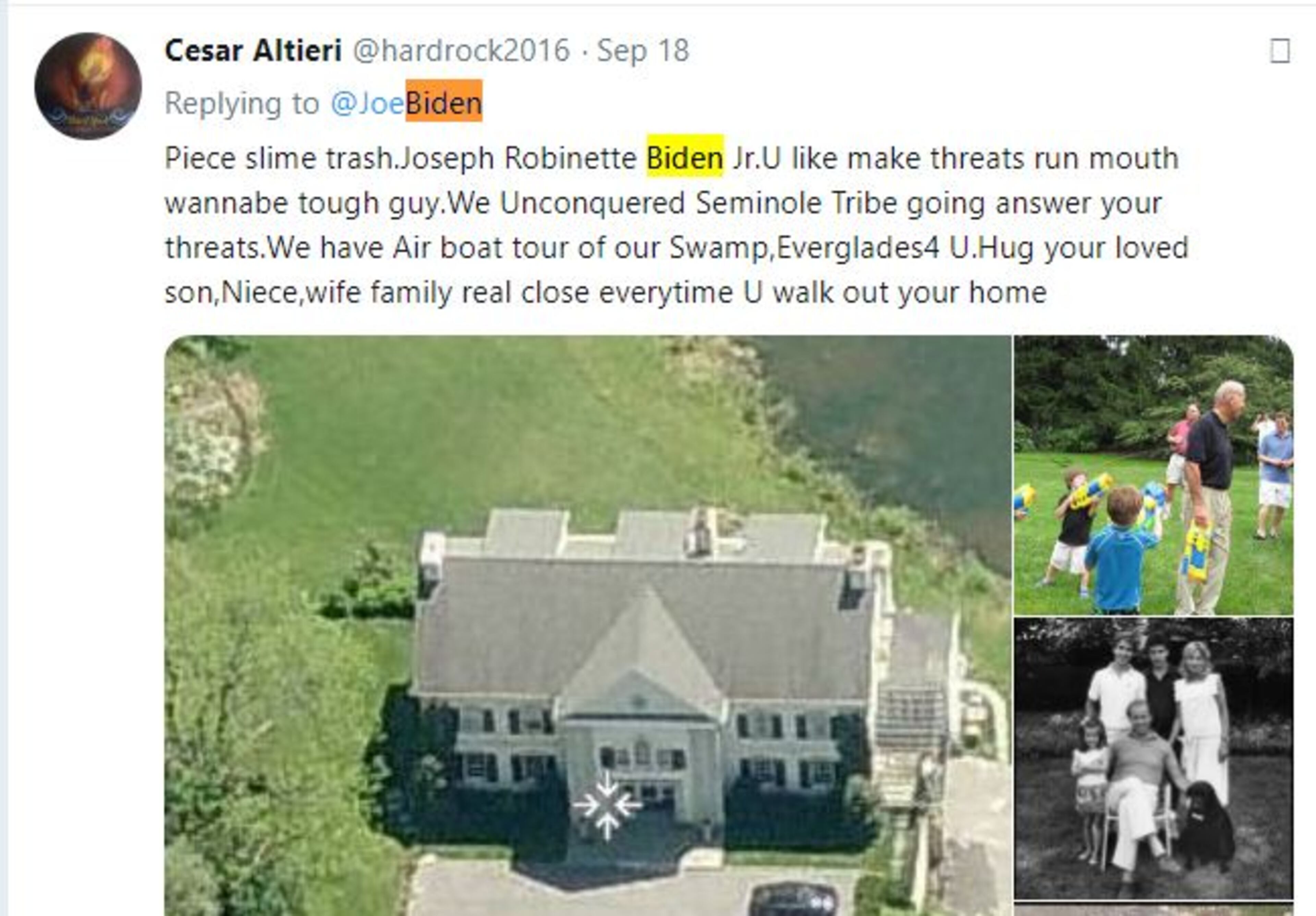 "Hug your loved son,Niece,wife family real close everytime U walk out your home," Sayoc posted on September 18, one of a number of tweets sent to Biden which were accompanied by threatening images.