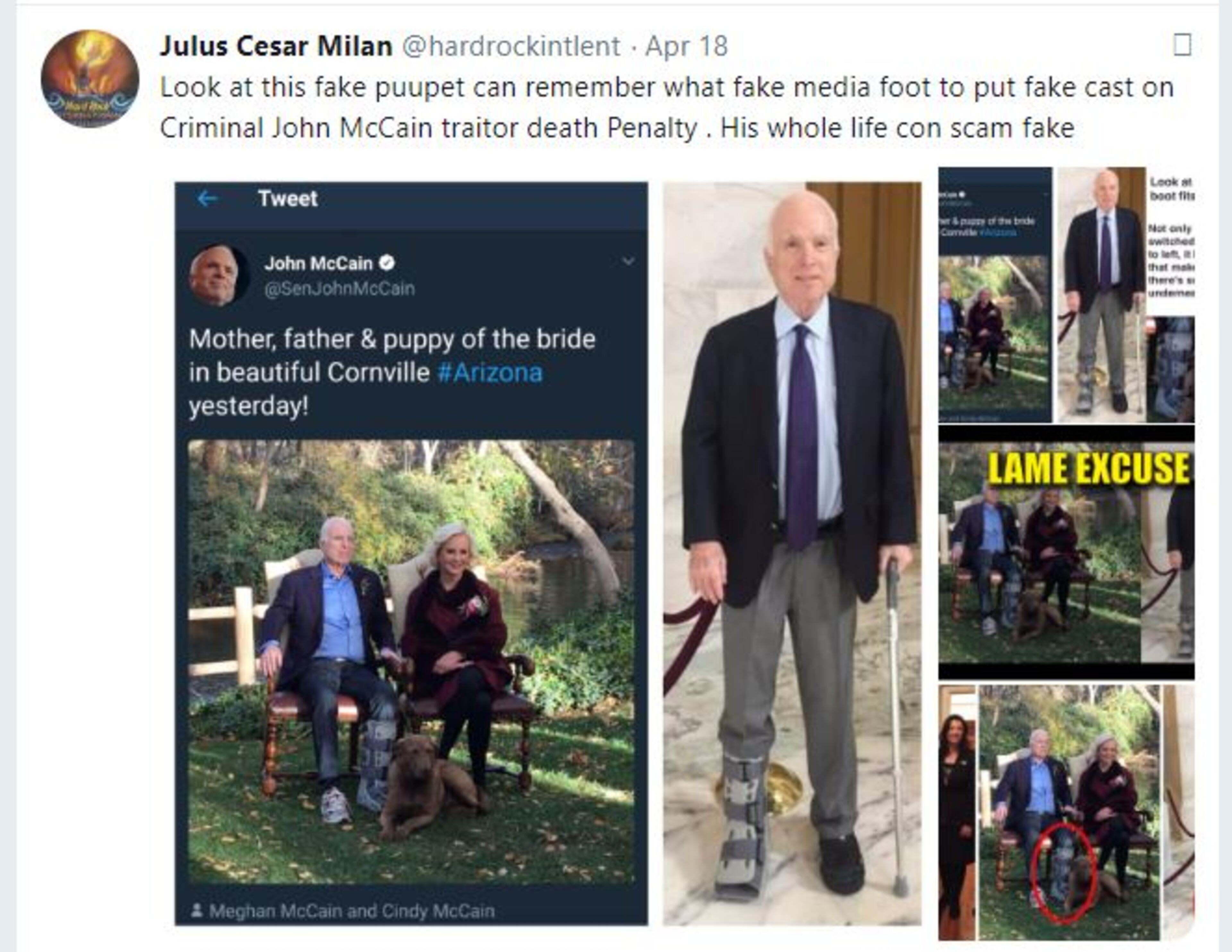 + Sen. John McCain (R-AZ) was targeted in an April 18 tweet, where Sayoc called him a 'fake puppet.' "Criminal John McCain traitor death Penalty. His whole life con scam fake," Sayoc wrote.