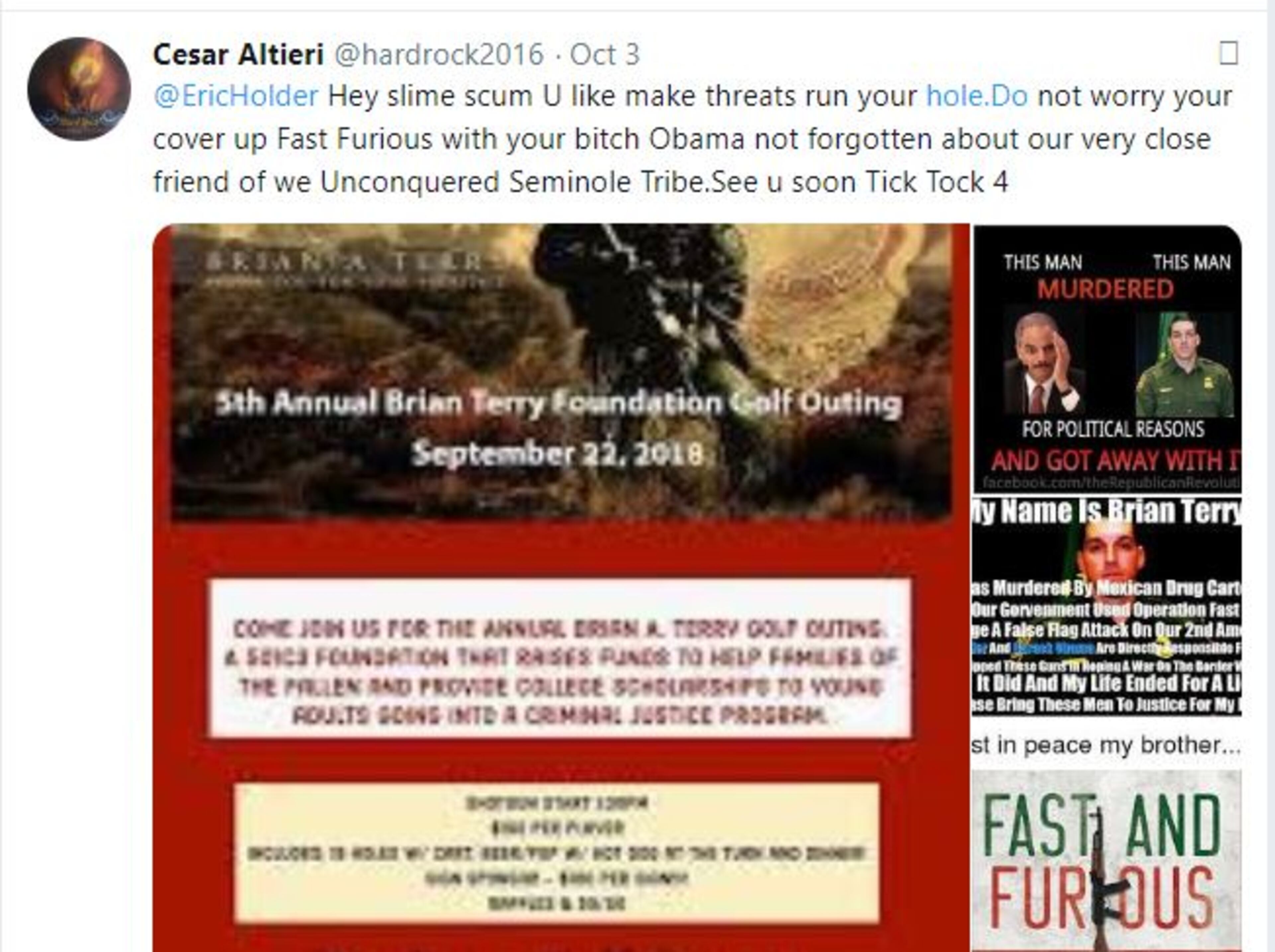 + Former Attorney General Eric Holder, who was the target of one mail bomb - "See u soon Tick Tock 4," read the October 3 tweet.