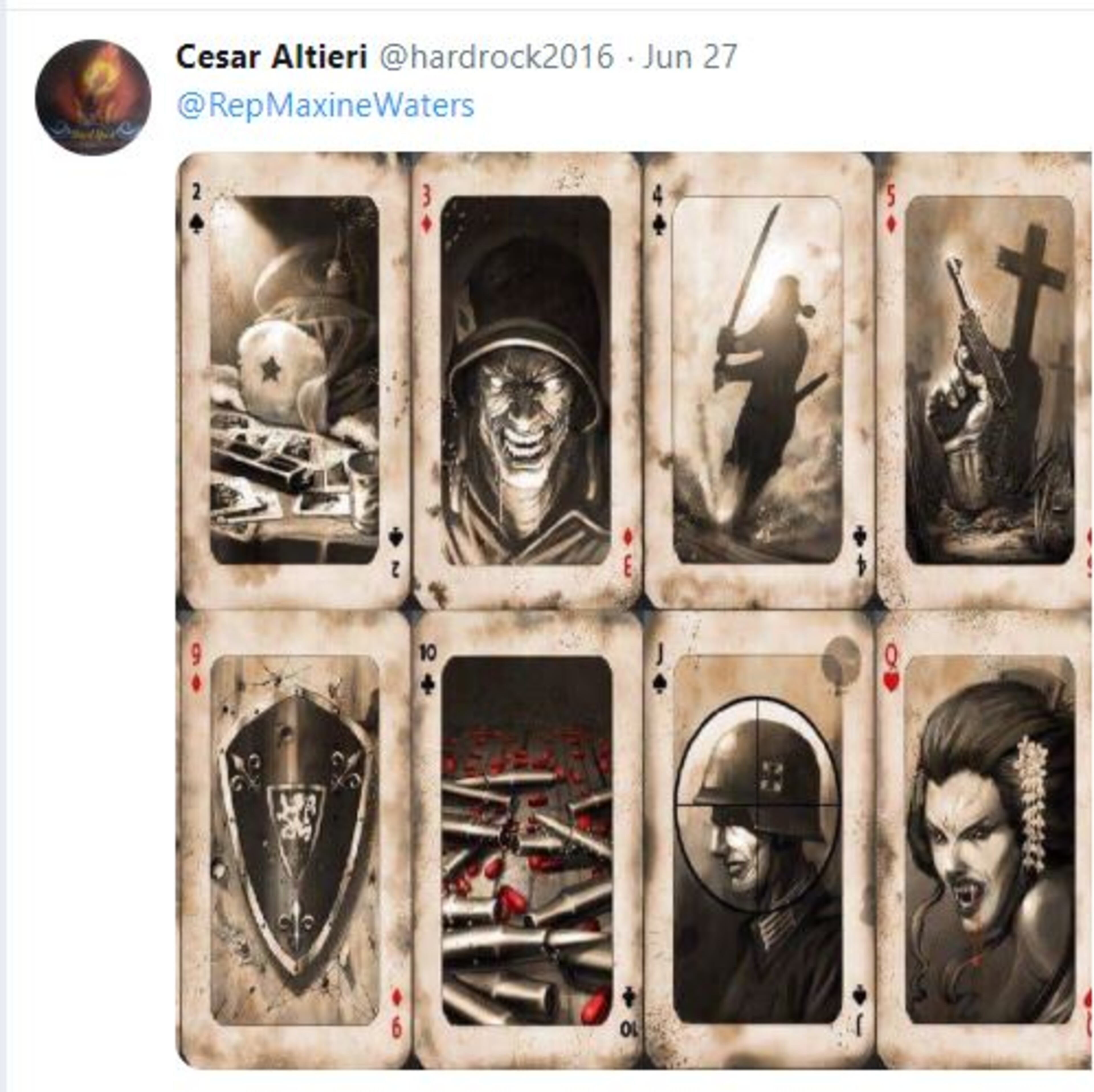 + Rep. Maxine Waters (D-CA), who was targeted by two mail bombs this week. "So you like to make threats," Sayoc wrote. "No@loud talk silence see you soon." It was one of a number of tweets about Waters.