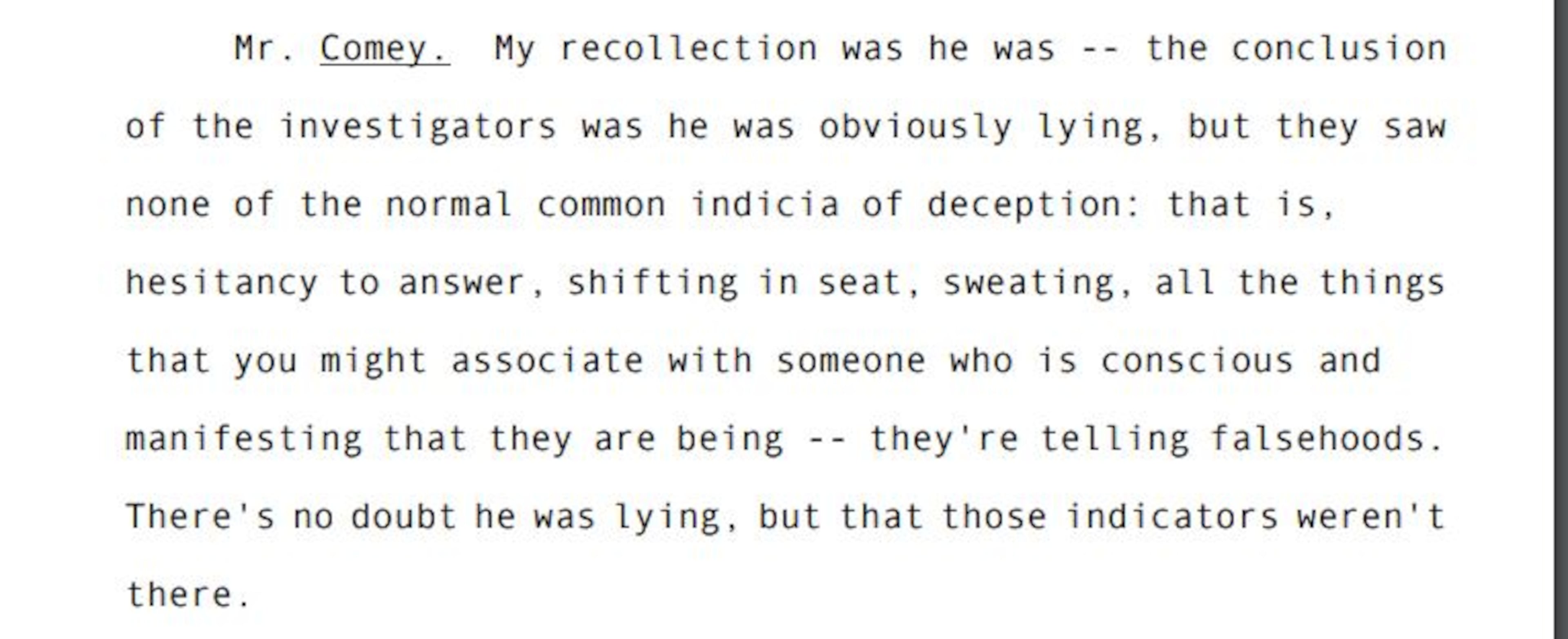 3. Comey says Flynn did lie, even if he didn't look it. Supporters of the President have made a big deal out of the evaluation of FBI agents that former National Security Adviser Michael Flynn didn't seem like he was lying about his contacts with the Russian Ambassador during the Trump transition. Pressed about that by Rep. Gowdy, Comey said it was clear that Flynn was lying. "I recall saying the agents observed no indicia of deception, physical manifestations, shiftiness, that sort of thing," Comey testified, as he summed up by saying of Flynn, "There's no doubt he was lying."