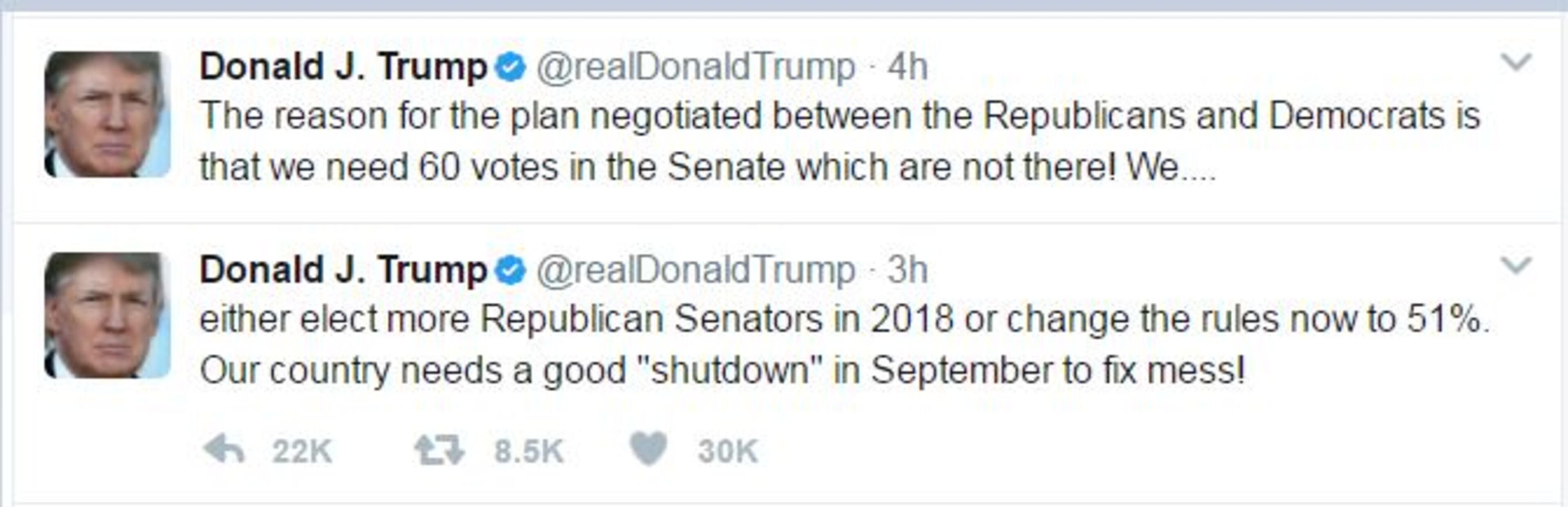 Earlier in the day, the President publicly complained on Twitter that he would have done more in the way of budget reforms - but that Senate rules mean his plan would need 60 votes to get by a possible filibuster - as the President seemed to threaten a government shutdown.