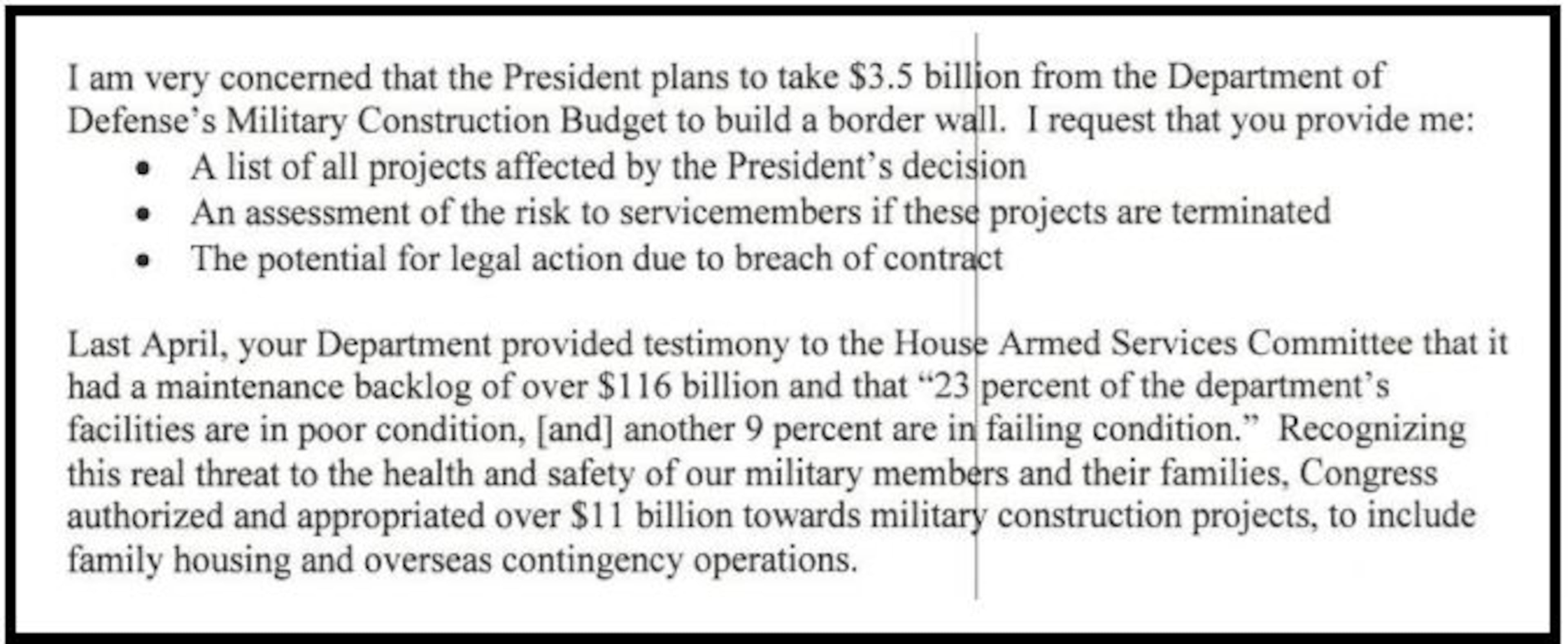 Congress approved $10.3 billion for military construction in Fiscal Year 2019 - the $3.6 billion sought by the President would be more than one-third of that amount - which has drawn expressions of concern from lawmakers.
