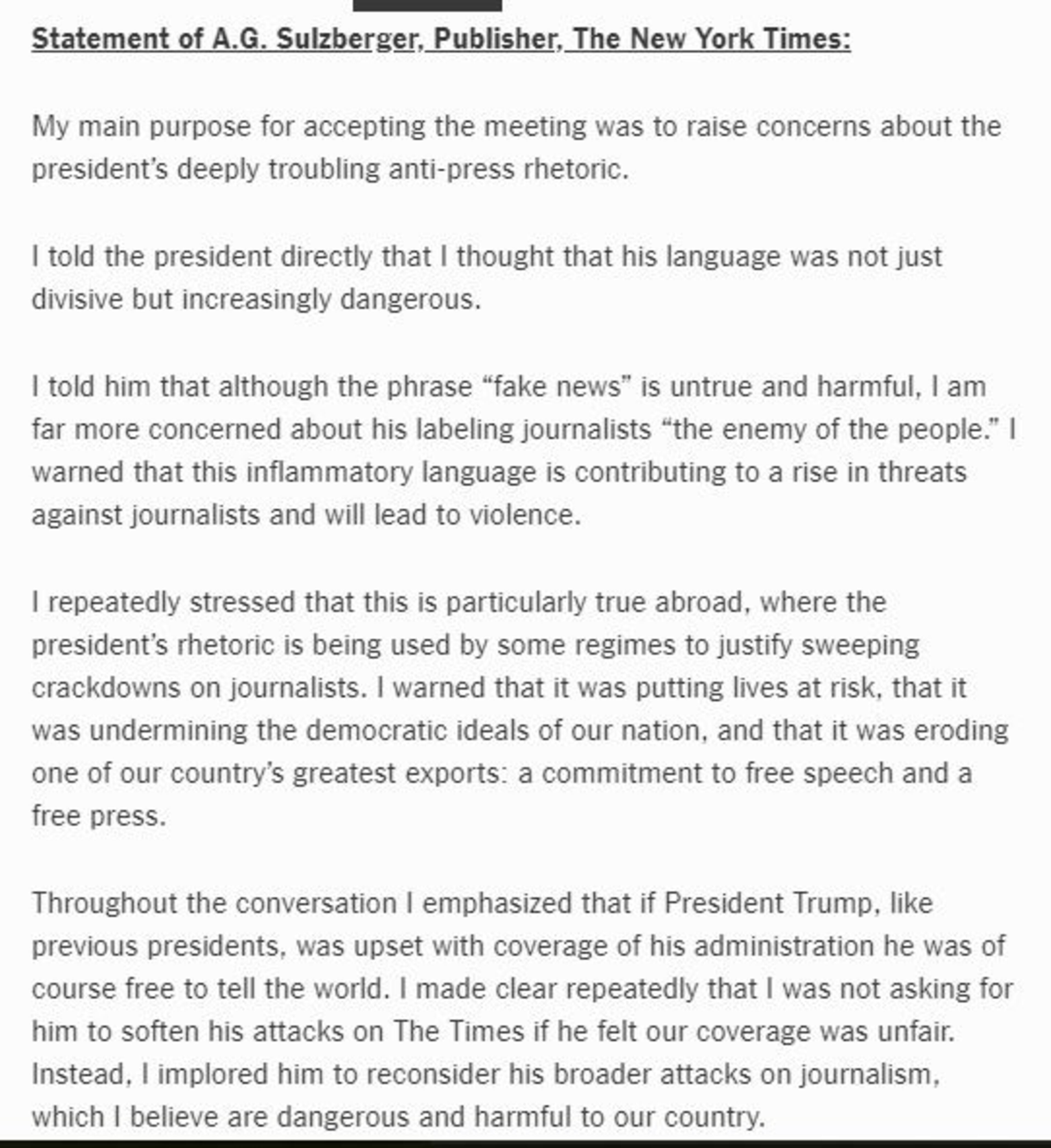 "I am far more concerned about his labeling journalists “the enemy of the people," Sulzberger wrote. "I warned that this inflammatory language is contributing to a rise in threats against journalists and will lead to violence."