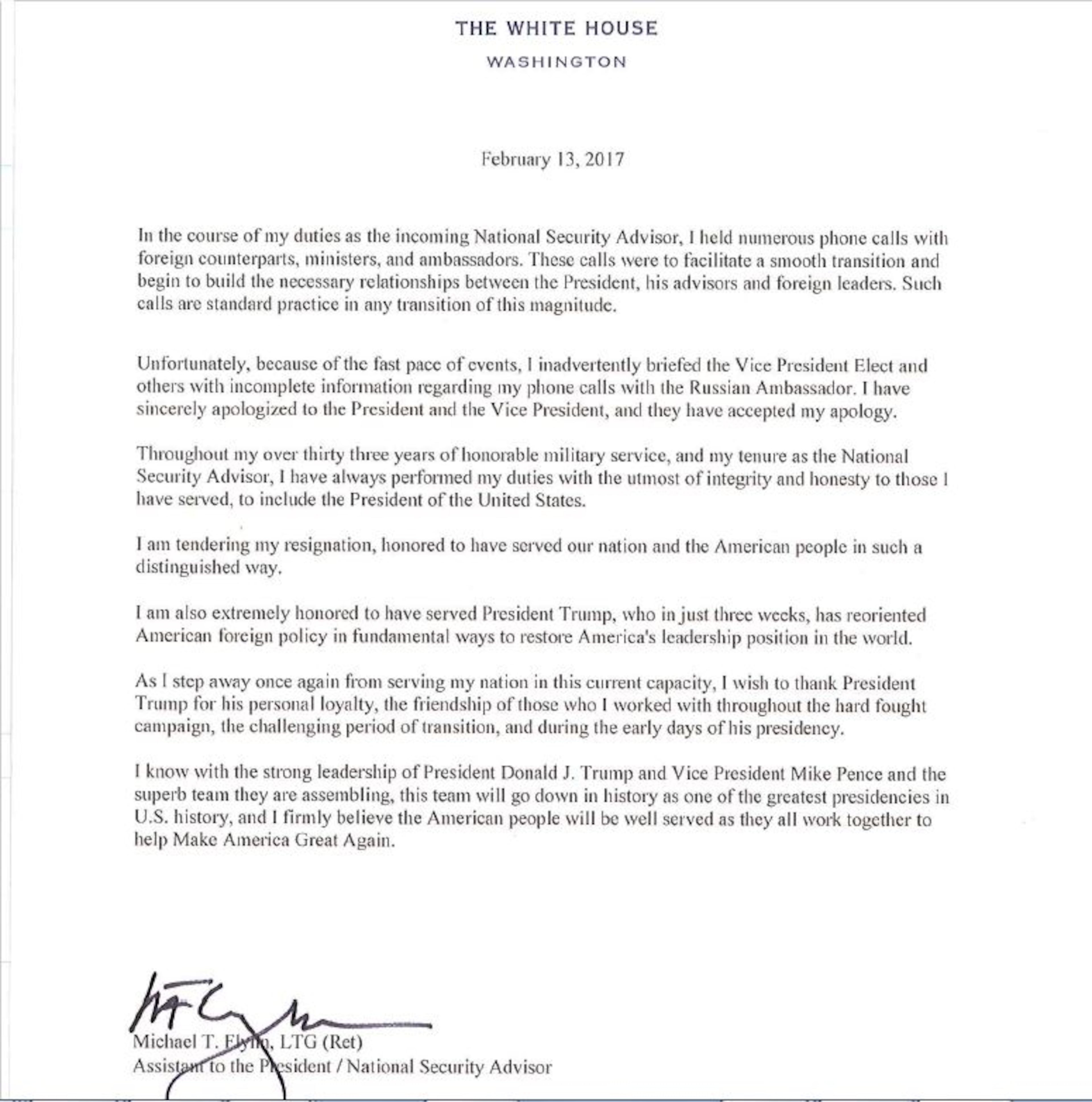 "I have sincerely apologized to the President and Vice President," said Michael Flynn in his resignation letter that was issued by the White House.