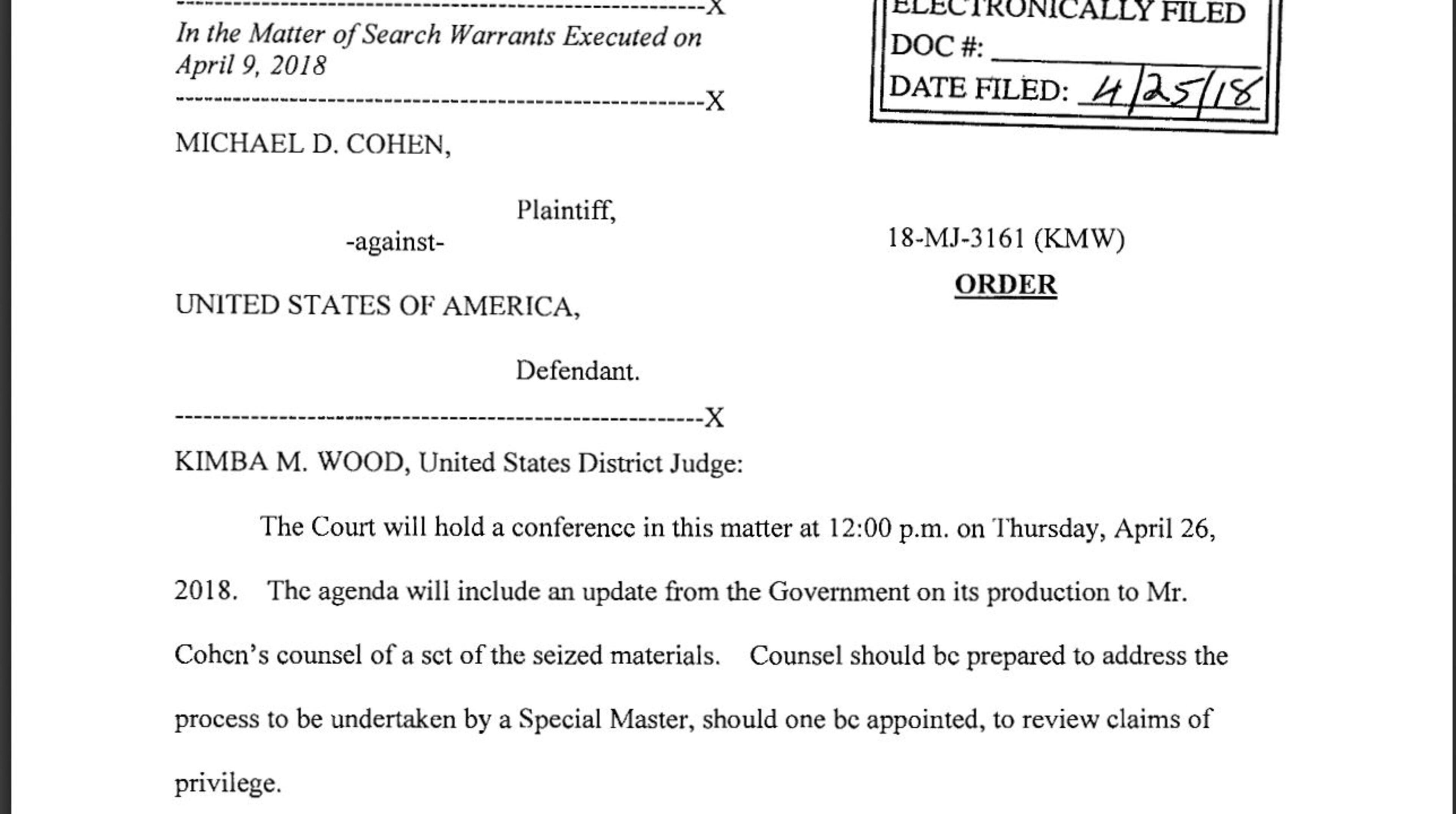 Judge Wood set a Thursday midday hearing to get an update from the FBI on what exactly was seized in the April 9 raids, and what has been duplicated and shared with Cohen and his lawyers.