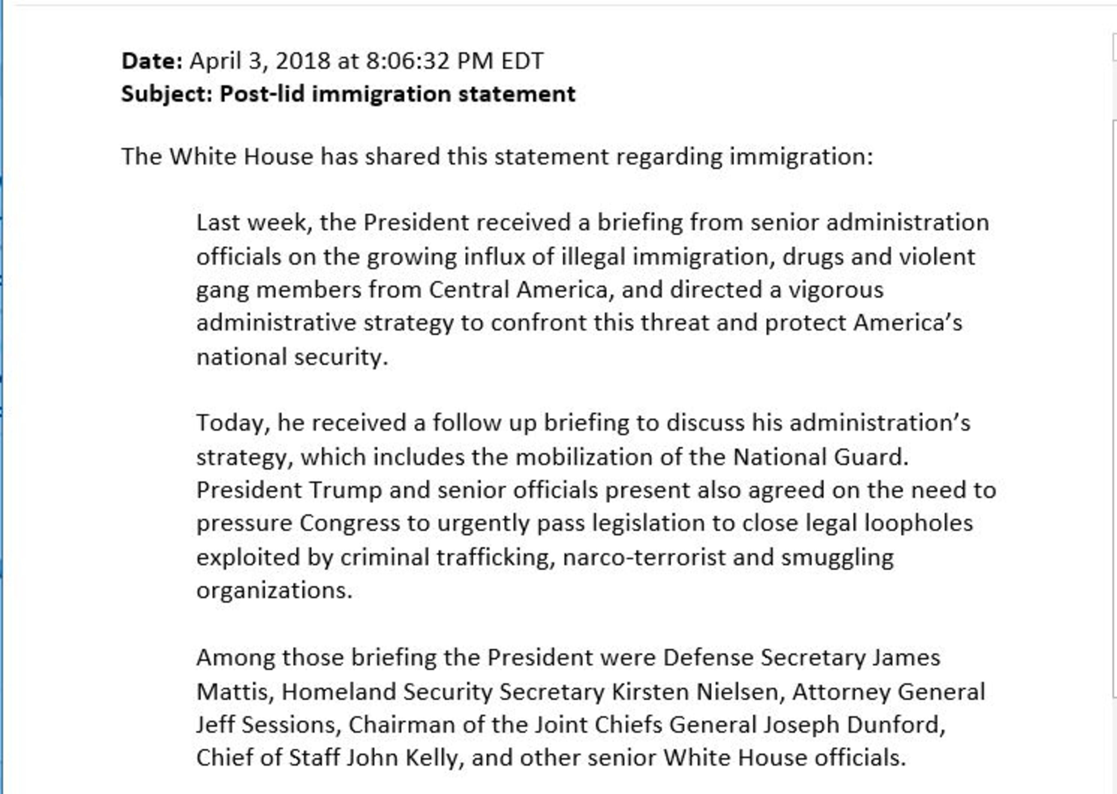 There was no indication given by officials on any official announcement of a new border plan, or new immigration legislation.
