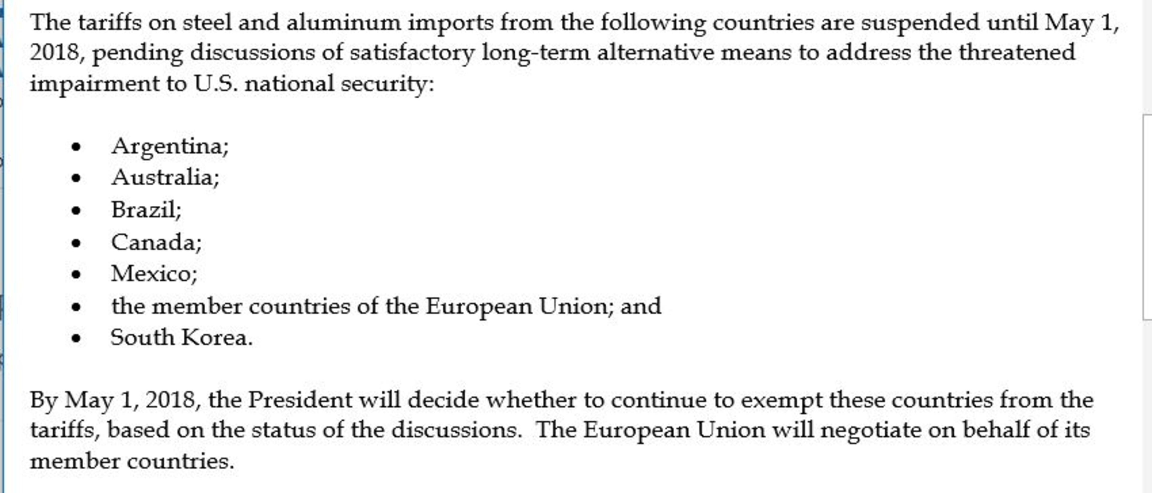 Meanwhile, late on Thursday night, the White House released a list of countries who will not see swift implementation of new tariffs on imported steel and aluminum, giving them more time to negotiate trade deals with the United States.