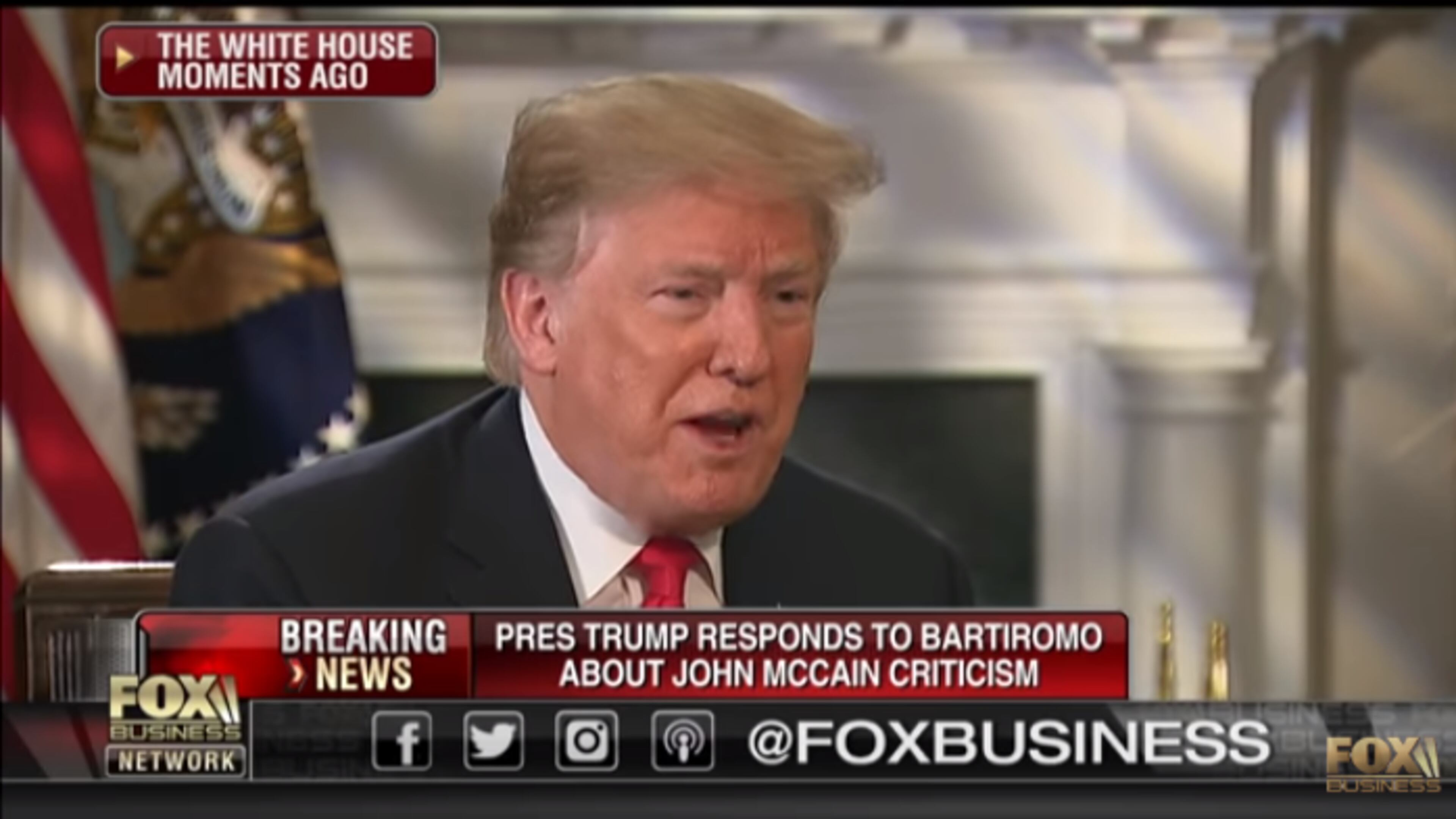 In an interview aired Friday morning by the Fox Business network, President Donald Trump again voiced his public displeasure about actions of the late Sen. John McCain (R-AZ), at one point admonishing TV host Maria Bartiromo for pressing him several times about why he was criticizing someone who is dead, suggesting that the subject wasn't supposed to be part of the exclusive White House interview.