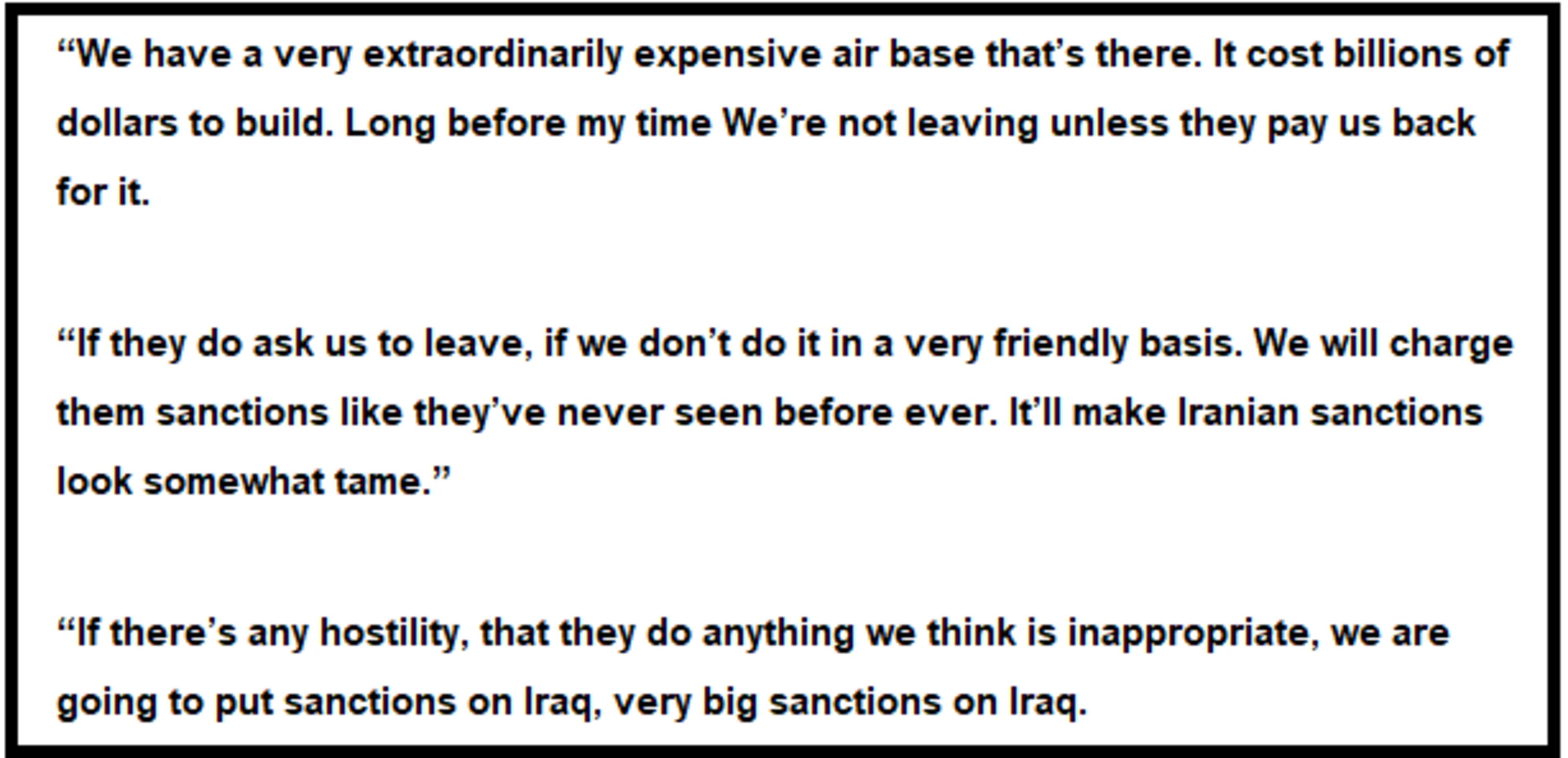 "We will charge them sanctions like they’ve never seen before ever," the President told reporters aboard Air Force One, as he threatened 'very big sanctions on Iraq,' hours after the vote of the Iraqi Parliament.