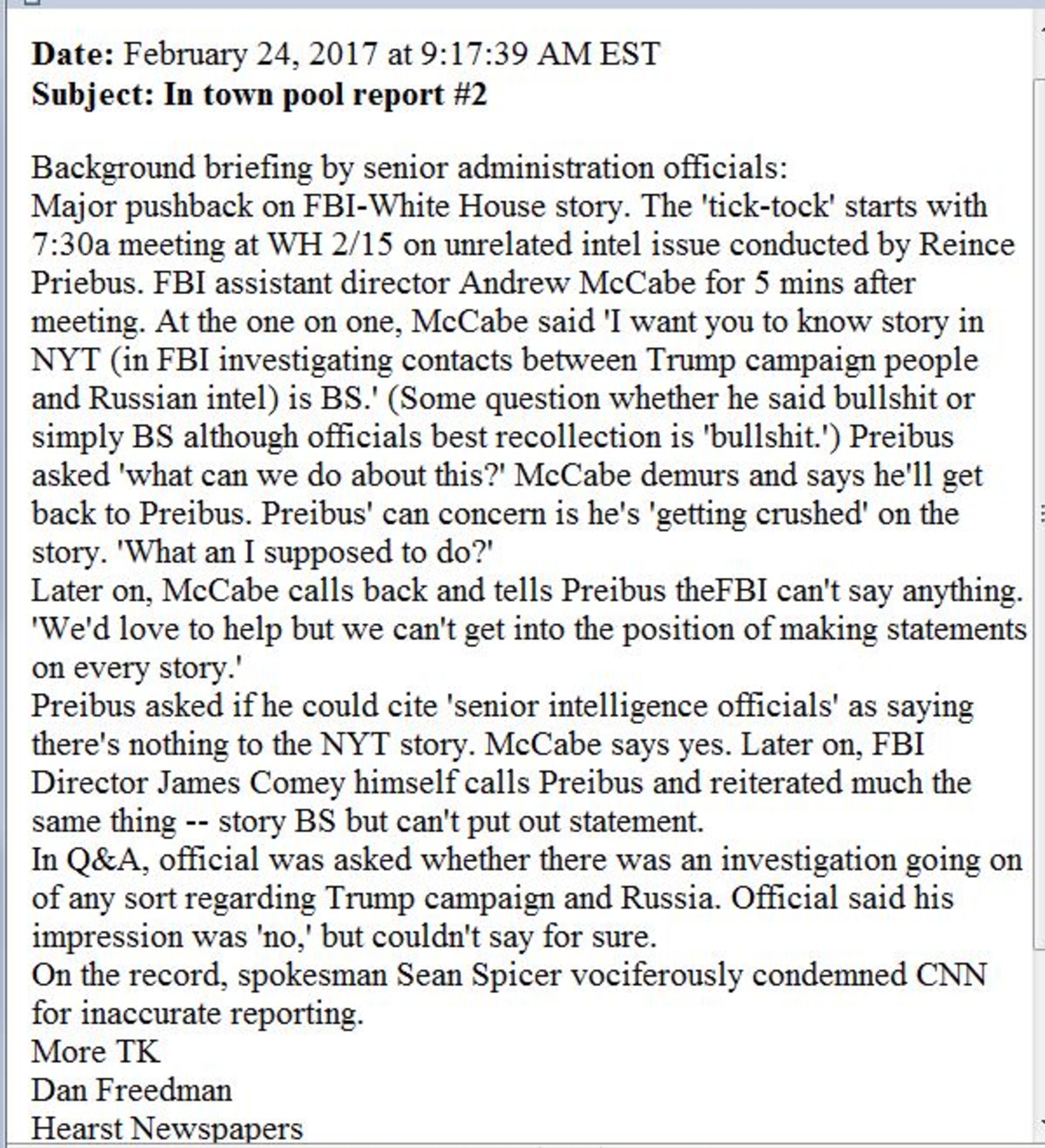 "Major pushback on FBI-White House story," read the White House Pool report by Dan Freedman of Hearst Newspapers: