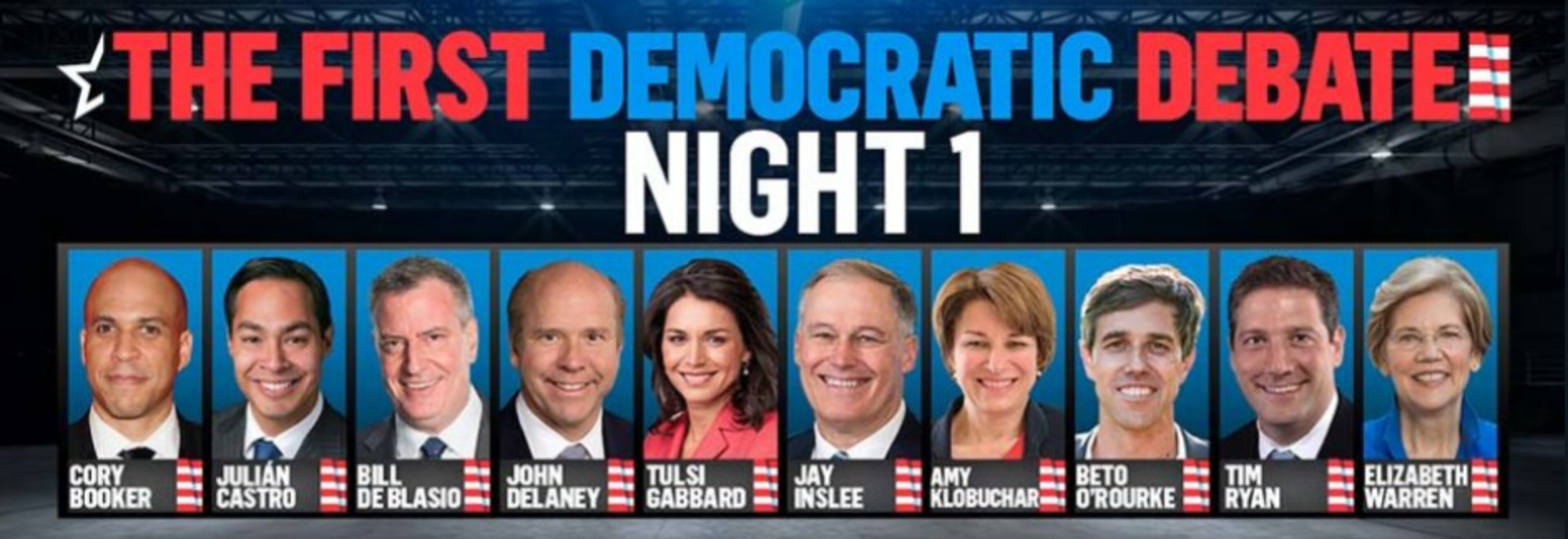 The first debate night in Miami features three Democratic Senators (Booker, Klobuchar, Warren), two House members (Gabbard, Ryan), two former House members (Delaney, O'Rourke), one current mayor (DeBlasio), one former mayor and Cabinet member (Castro), and one Governor (Inslee).
