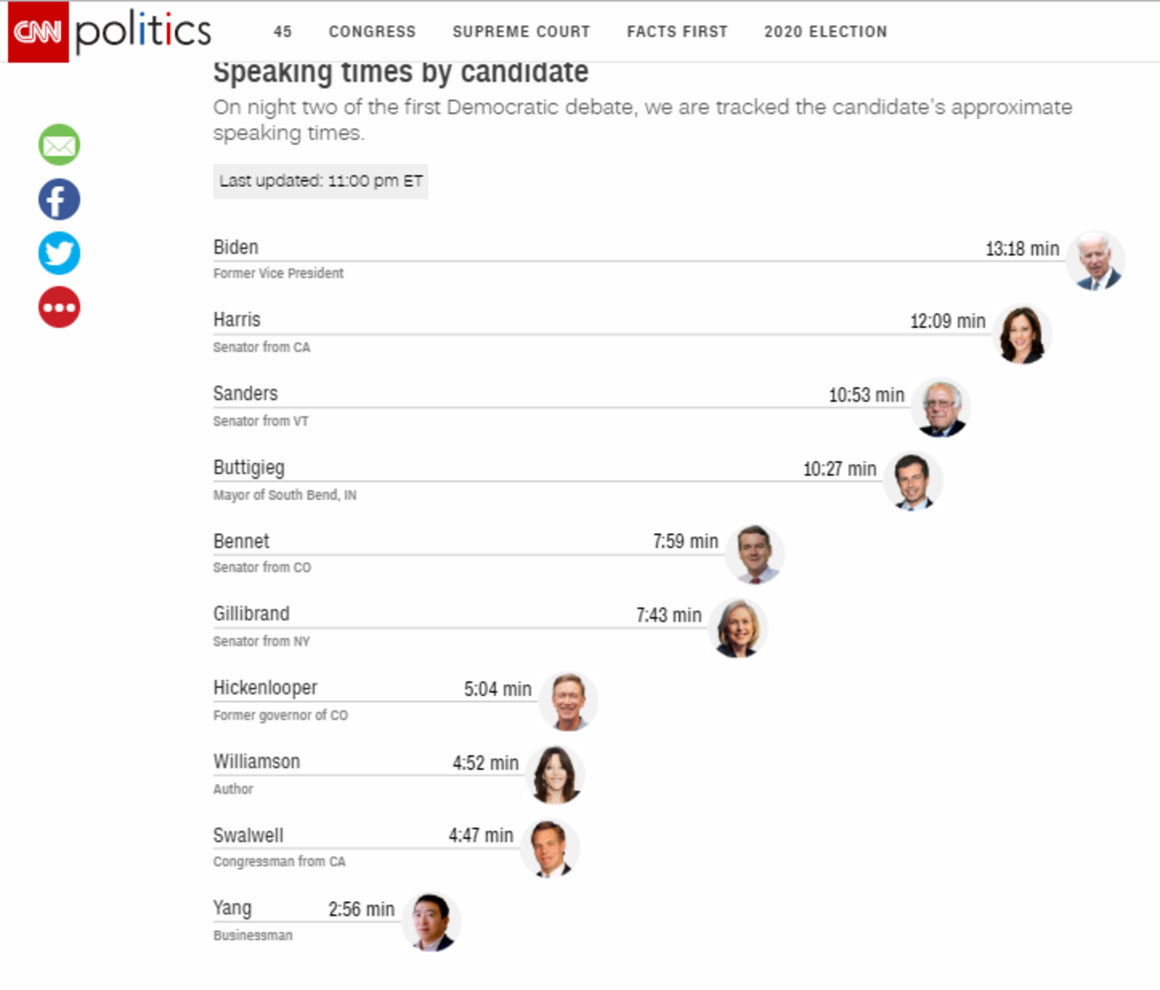 5. 10 candidates on a debate stage is just too many. The Republican debates suffered in 2015 and 2016 with an overabundance of candidates. In the first Democratic debate, Jay Inslee spoke for a total of five minutes, the least of any of the ten candidates. Andrew Yang did even worse in the second, with just under three minutes. Joe Biden had over 13 minutes in the second debate, while Cory Booker spoke for almost 11 minutes, which was the most in the first debate.