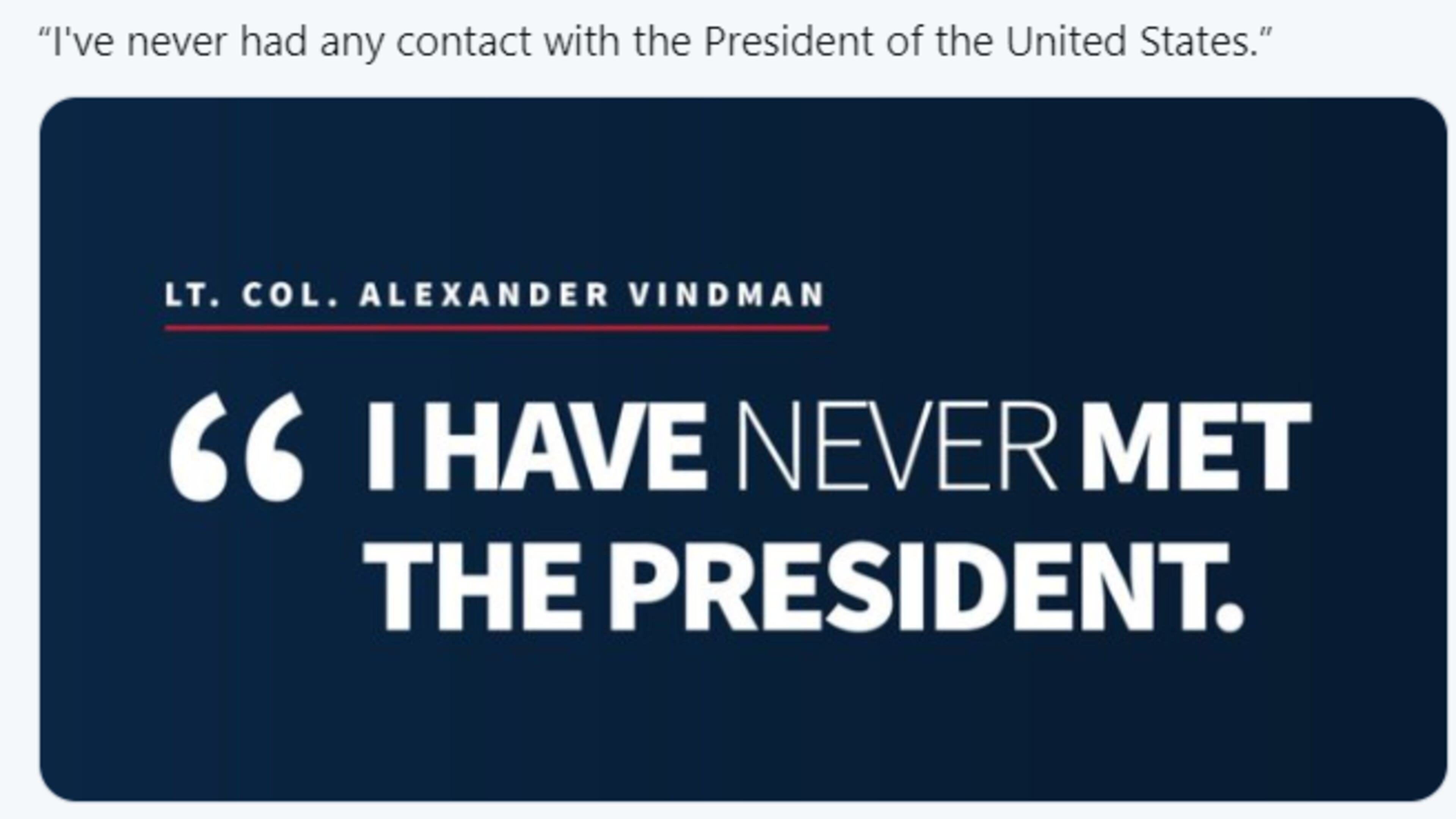 "I don't know what the President was thinking," was one of a series of quotes from Vindman tweeted out by the White House, part of a GOP effort to argue against impeachment hearings led by Democrats in the House.