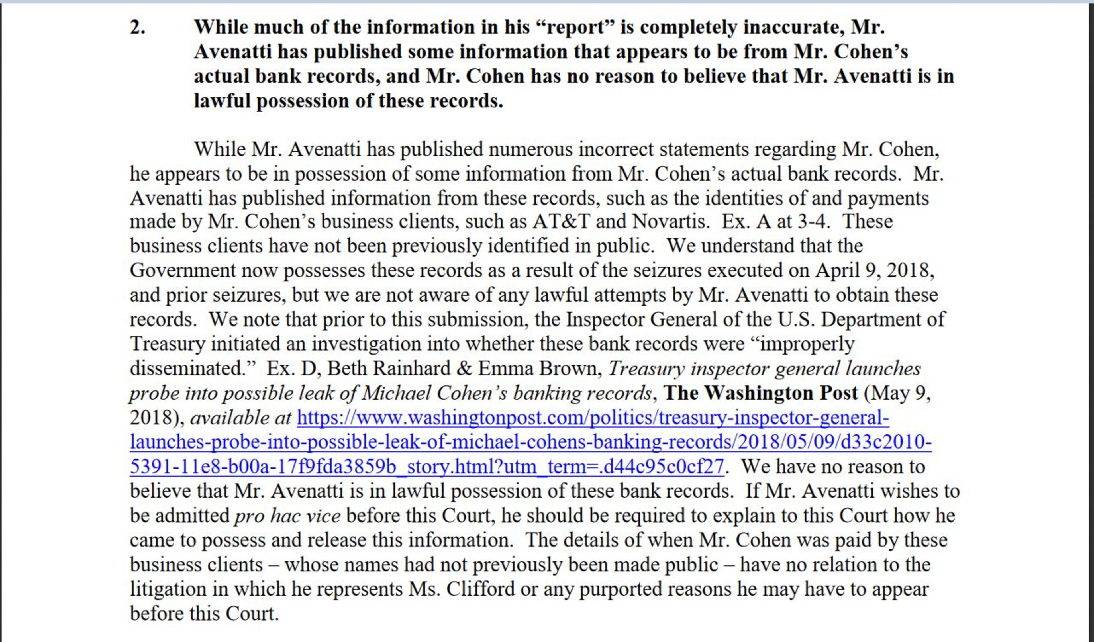 Cohen's lawyers noted that the Treasury Department started an investigation to find out how information about Cohen had been leaked to Avenatti, who continued to attack Cohen at every turn.