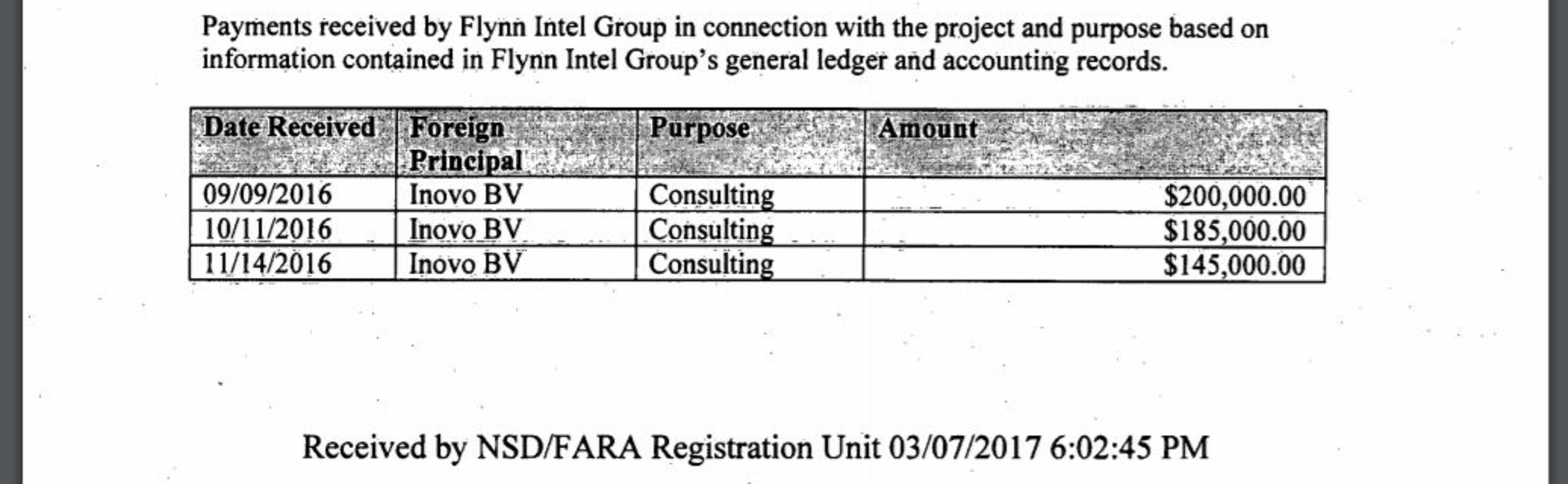 Legal filings made this week indicated that Flynn's company - Flynn Intel Group - was paid $530,000 total in three different payments by a Dutch company named Inovo BV, which is said to have close ties to the Turkish government.