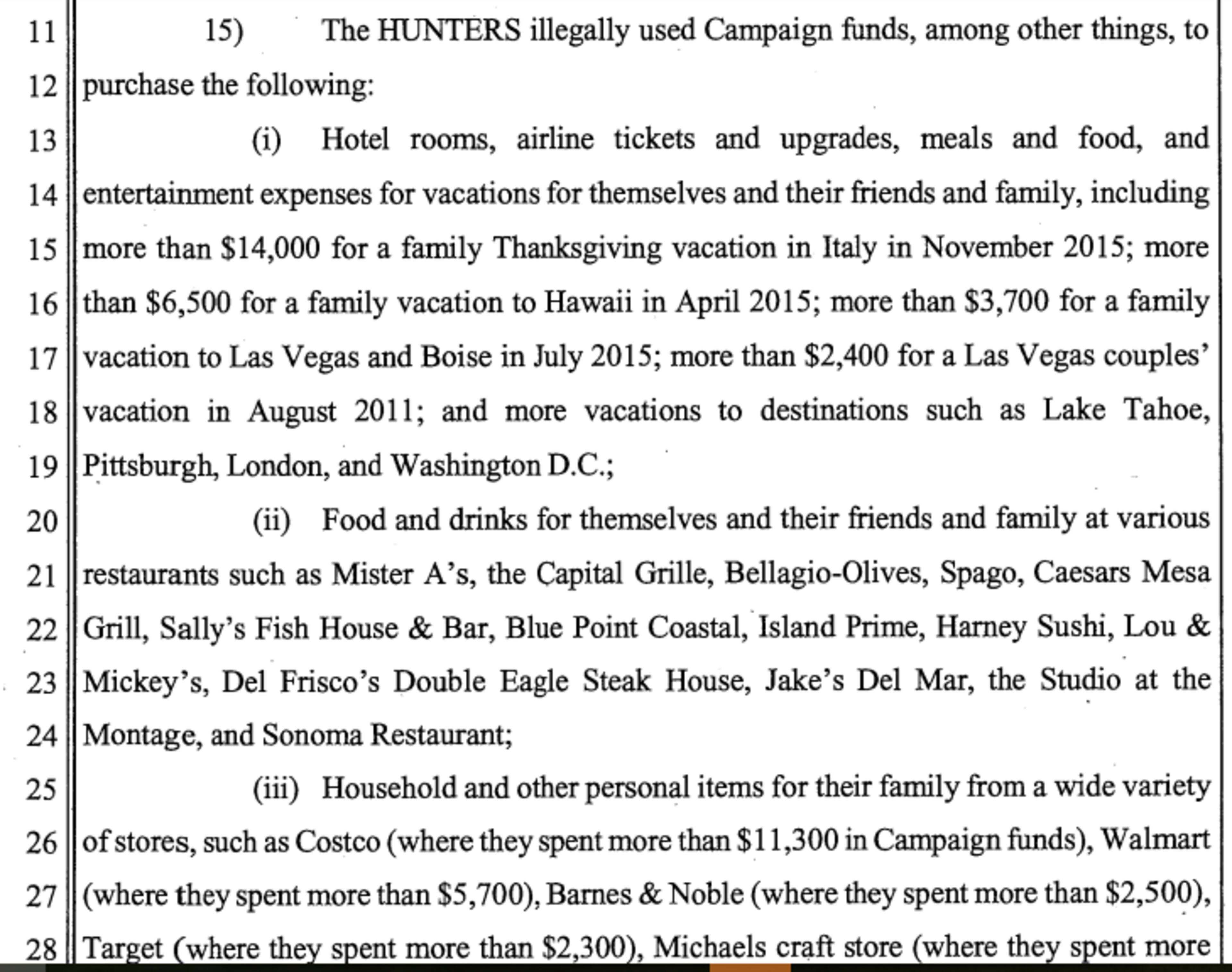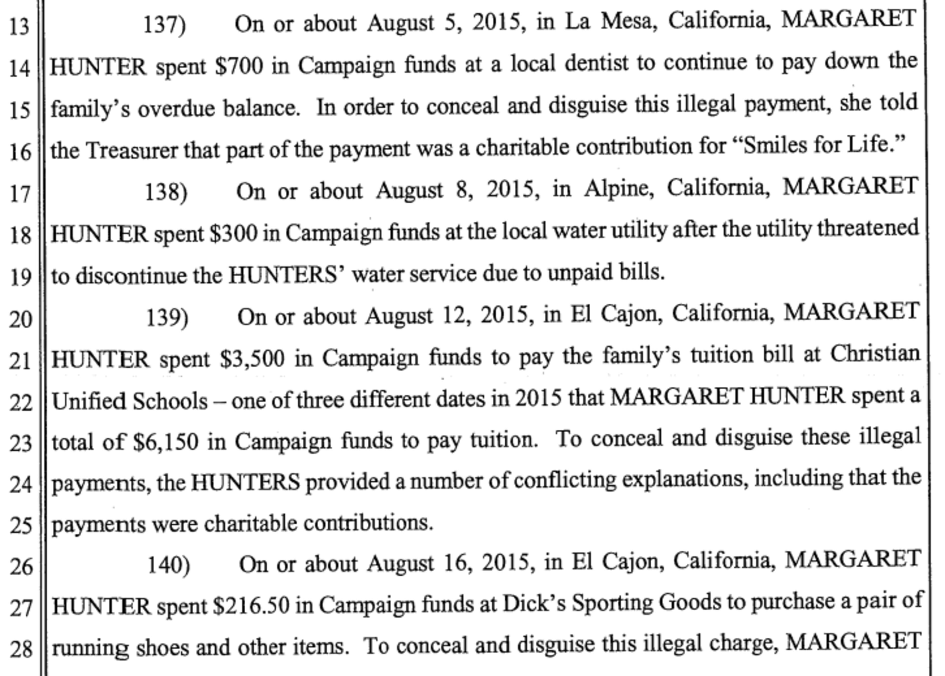 The charges against the Hunters were highly detailed, showing that they funneled campaign money to their own personal use for vacations, hotels, dinners - and a wide variety of domestic items, including groceries, payments for a dance competition, video games, school lunches for their children, dental work, dog food, utility bills, and even private school tuition.