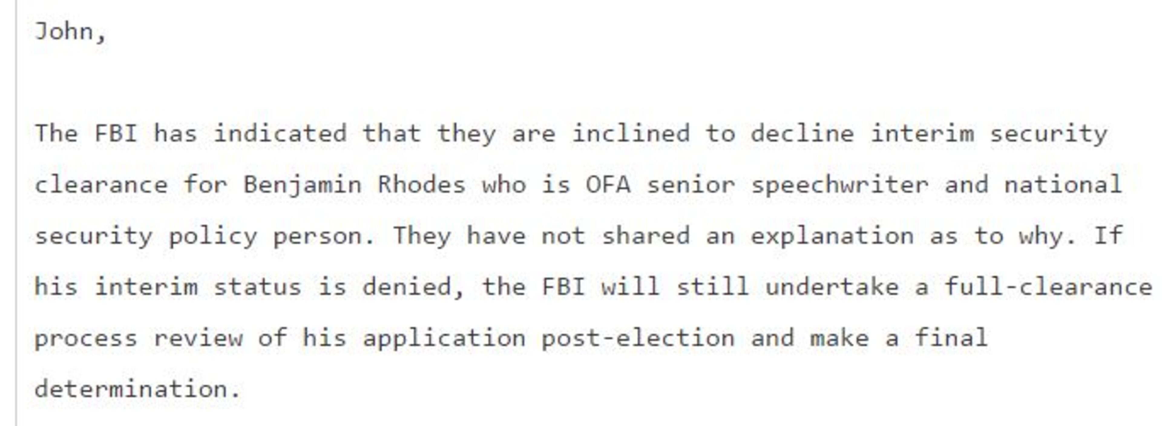 3. What was the problem with a top Obama staffer? Since the Podesta emails go back in the 2008 campaign and transition for President Obama, there are some tidbits about that era from time to time as well. In this email, Podesta is told that the FBI does not want to give a security clearance for the transition to Ben Rhodes, who ultimately will become a Deputy National Security Advisor. But back in 2008, the FBI had some undetermined concern about Rhodes. It reminded me that back in 1987, the Secret Service would not allow me to get a press pass at the White House because of something in my background. They refused to tell me what it was, and finally relented four years later.
