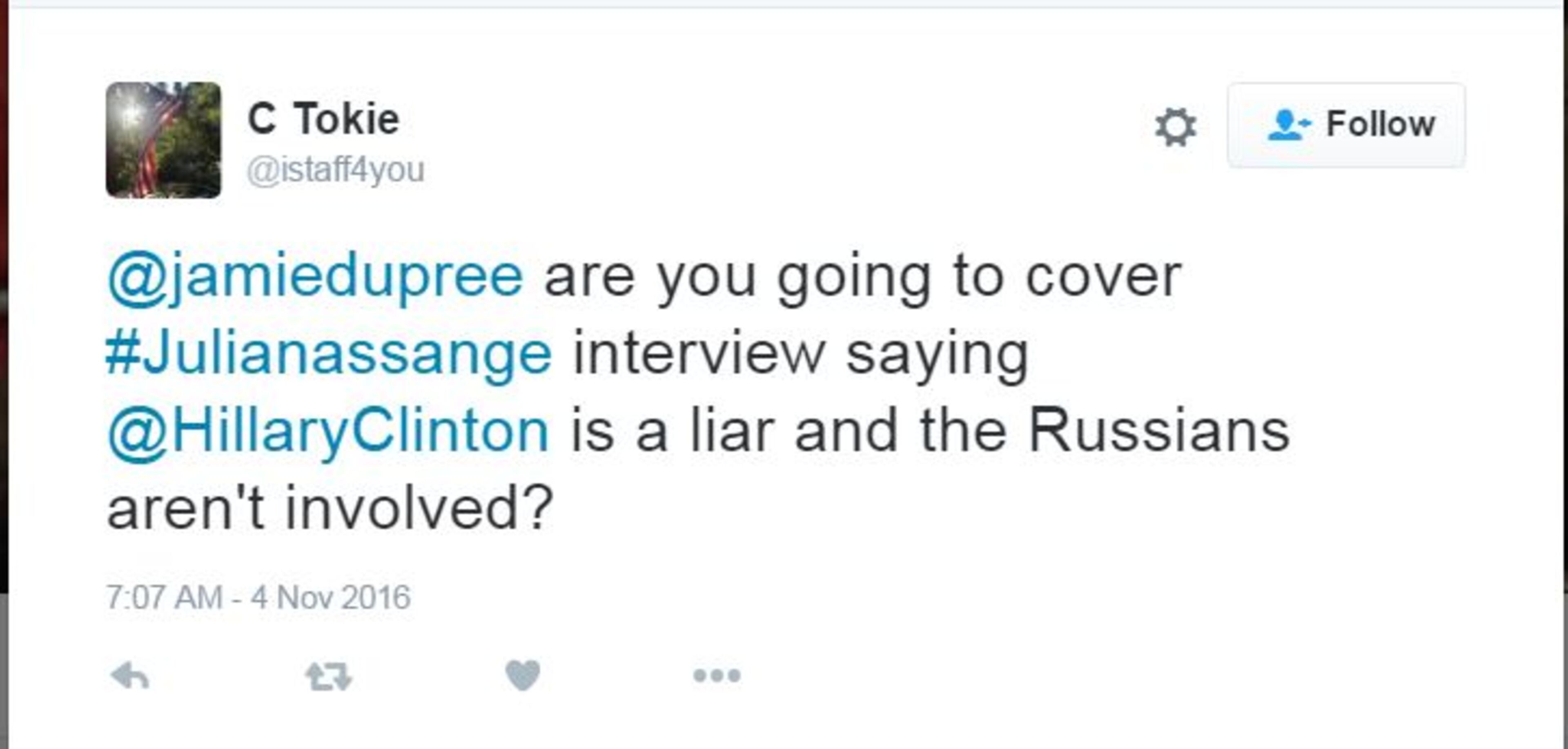 5. The source of the Podesta emails. Critics of Hillary Clinton, who have recently become champions of Wikileaks founder Julian Assange, have become very vocal in recent days about charges that Wikileaks is nothing but a front for Russian Intelligence. In an interview, Assange again denied that Russia had delivered the Podesta emails to the internet group, which has all but morphed into a conservative campaign website in recent weeks. Some intelligence experts do believe the Russians are involving, and it aggravates the daylights out of Assange.