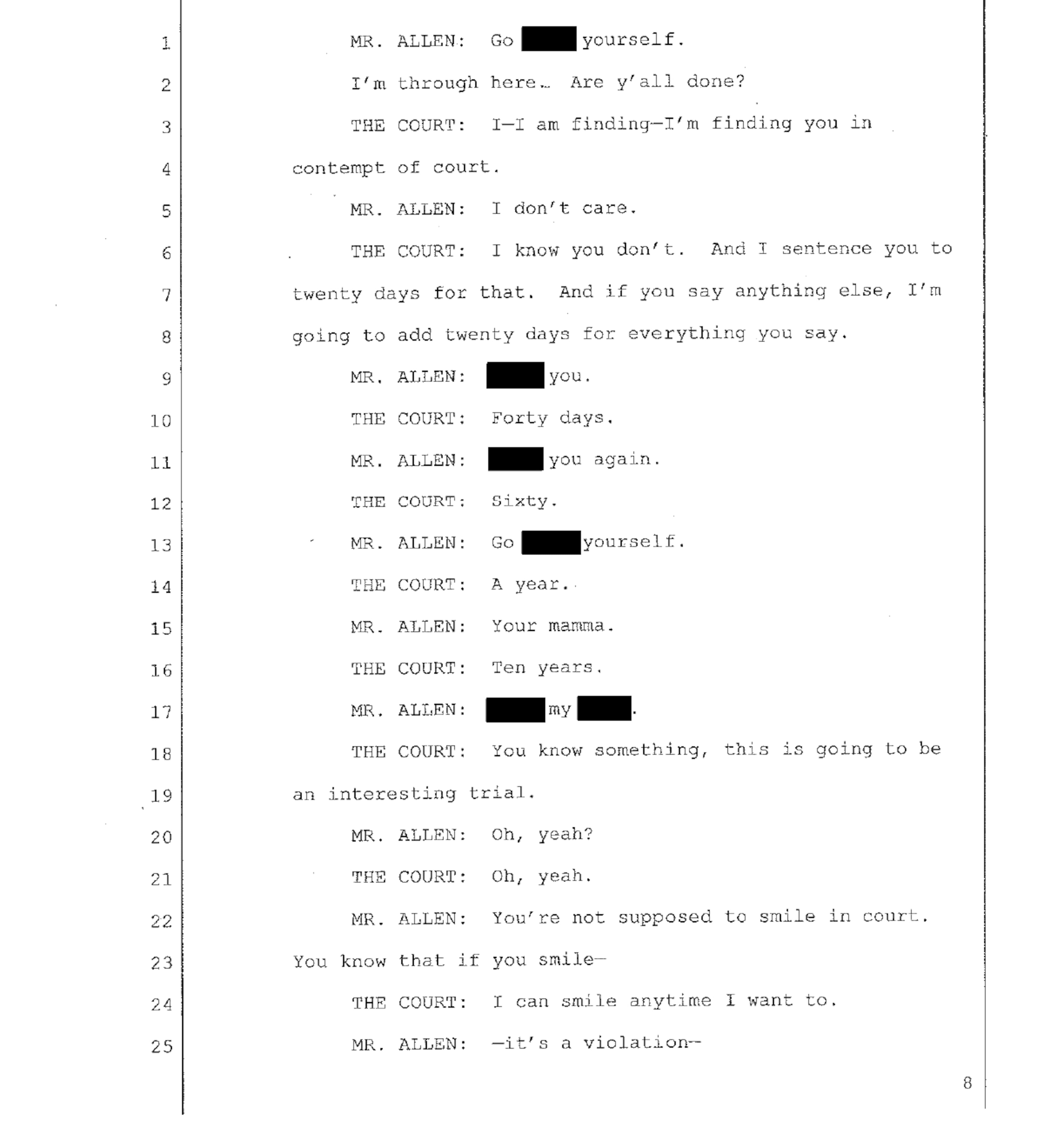 Durham then sentenced Allen to 20 days for contempt and said if he said anything else, he’d add another 20 days for everything else he said.