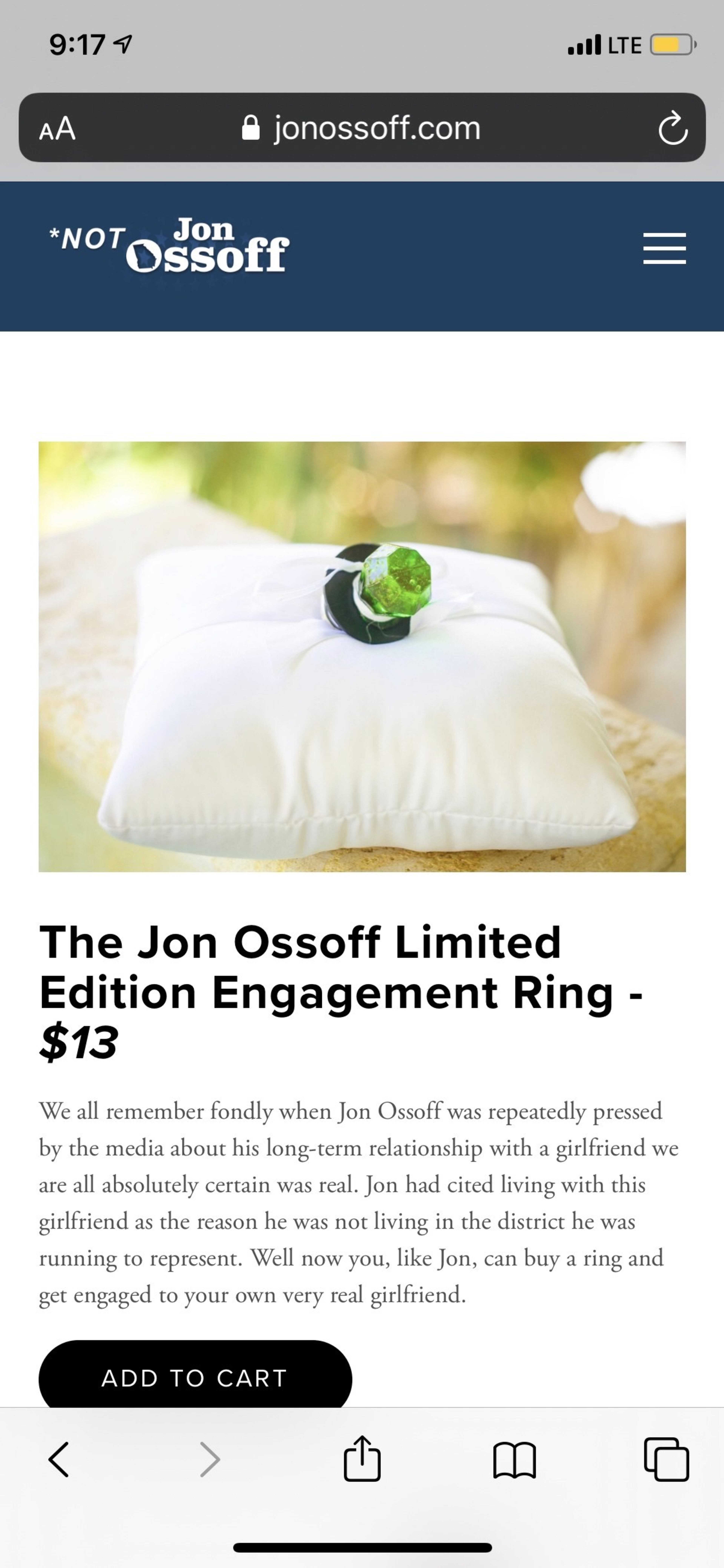 The listing said Ossoff was pressured about his “long-term relationship with a girlfriend we are all absolutely certain was real” and that customers who buy it can “get engaged to your own very real girlfriend.”