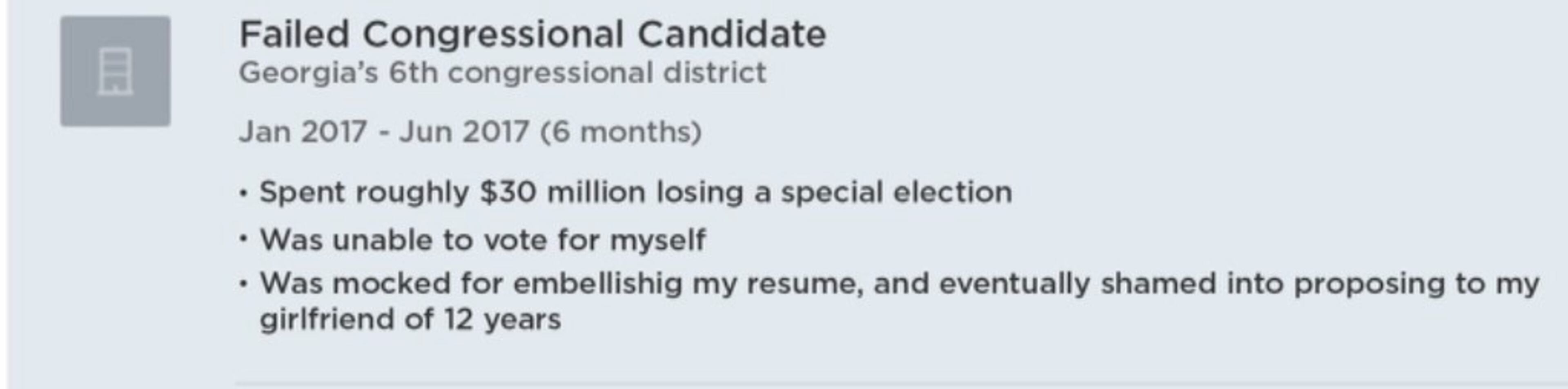 The attacks were tucked into a parody website of Ossoff's campaign after Republicans snapped up the JonOssoff.com domain name. Along with jabs at his unsuccessful 2017 run for a U.S. House seat, the website includes a fake LinkedIn-type profile that includes this line: