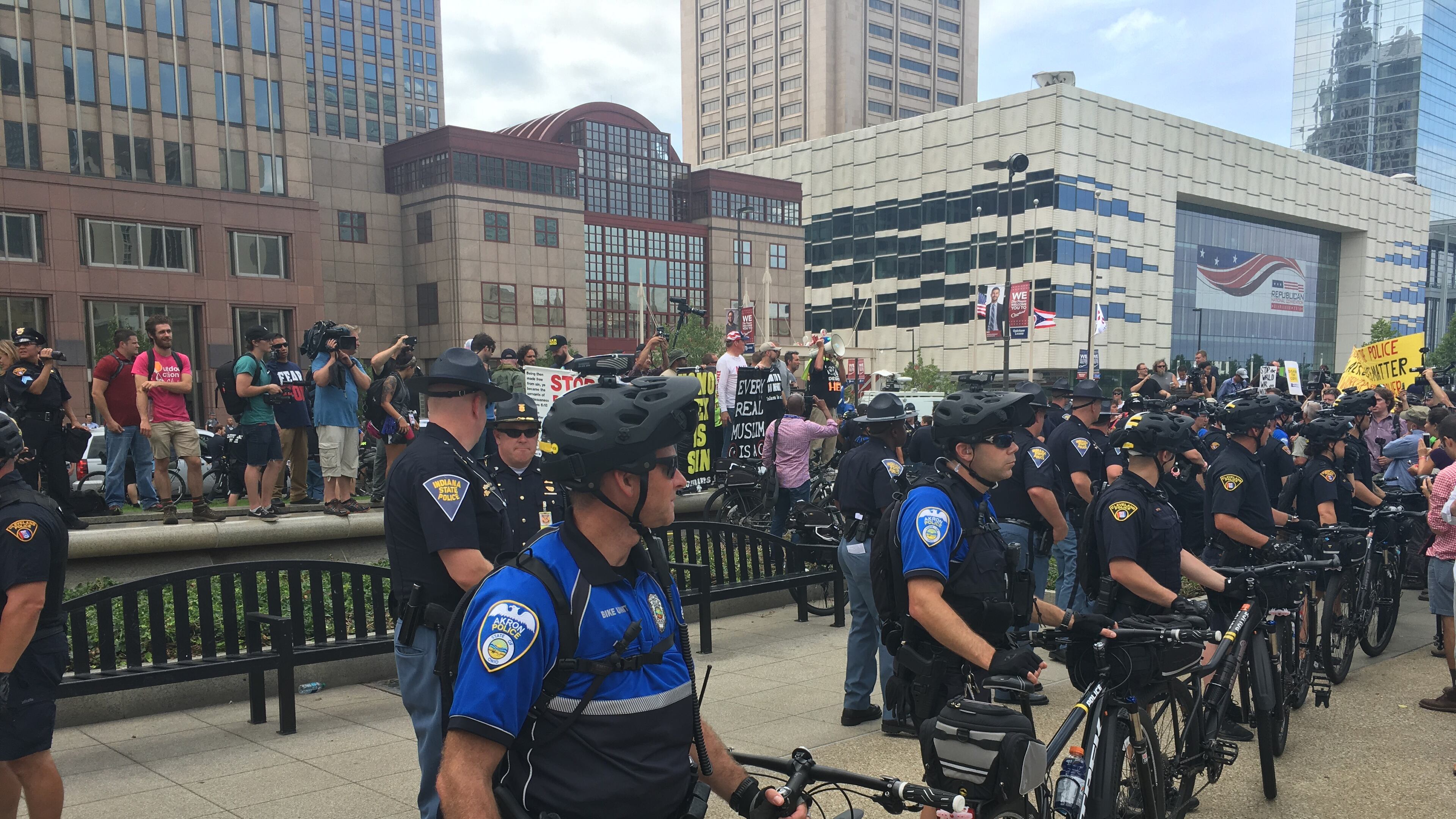 There were several pro-Trump and anti-Trump demonstrations crisscrossing the city as thousands of delegates streamed into the Quicken Loans Arena, but they remained peaceful amid a huge show of force from law enforcement officials.