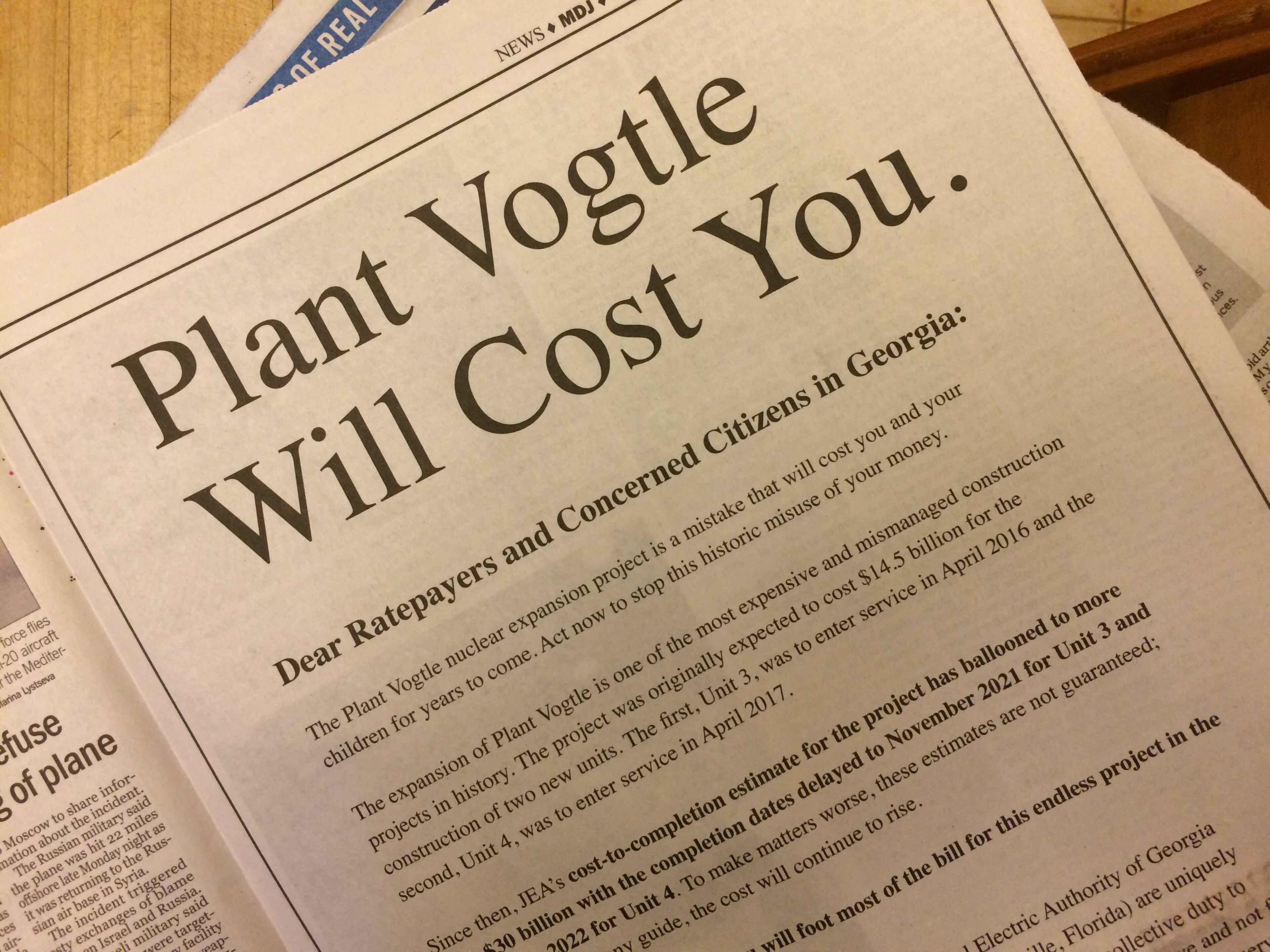 Full-page ads, which ran in newspapers in Marietta and Newnan on Wednesday, referred to Georgia Power’s effort to complete the Plant Vogtle project as “one of the most expensive and mismanaged construction projects in history.”