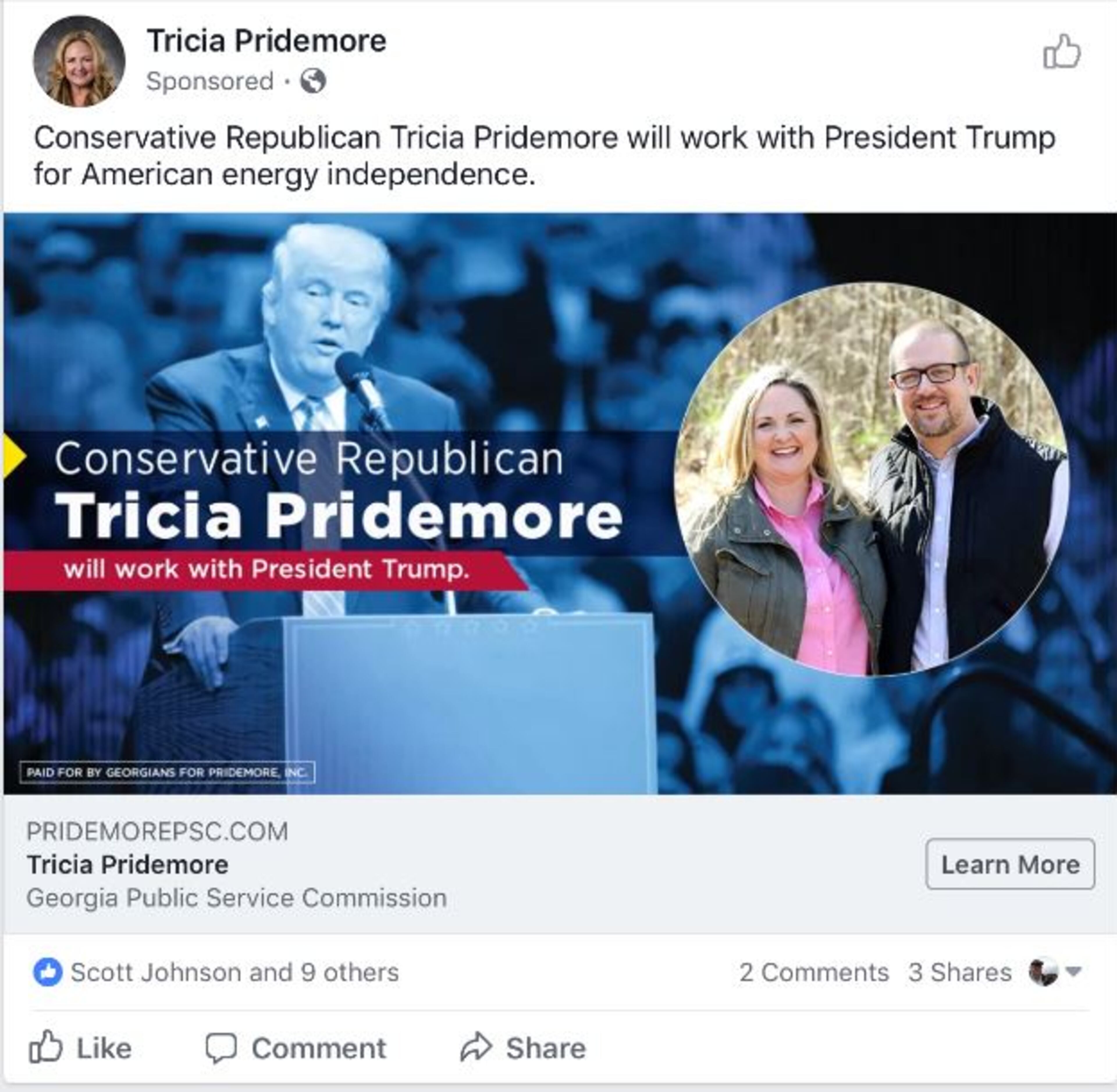 Speaking of Donald Trump. We told you earlier that Republican incumbent Public Service Commission member Tricia Pridemore has primary opposition. Agents of her GOP rival, John Hitchins, have criticized Pridemore for posting comments critical of Trump on social media. Earlier this month, she responded by hiring two Trump campaign hands. And now we've spotted one of her Facebook ads. Pridemore's image isn't the dominant one. That honor goes to Trump, of course, with this headline: "Conservative Tricia Pridemore will work with President Trump for energy independence."