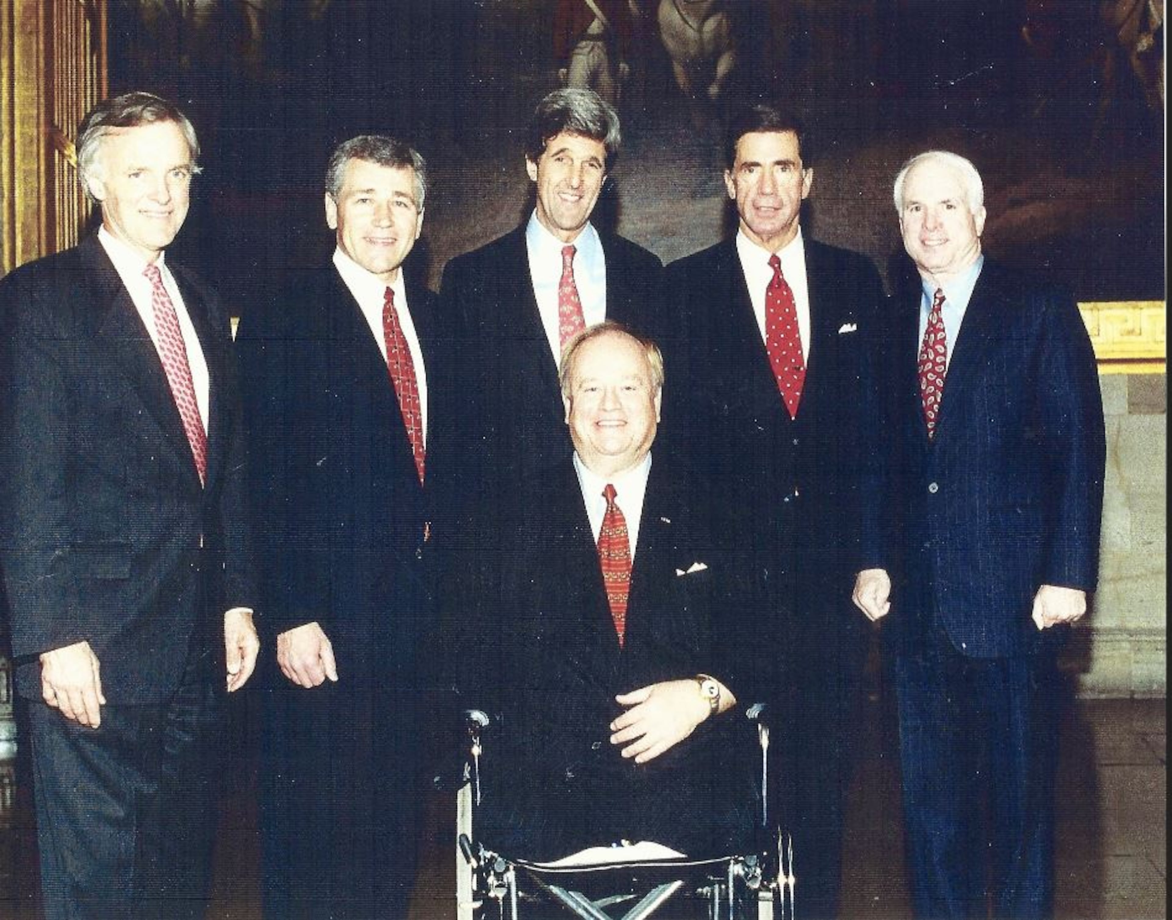 It looks to have been taken upon Cleland’s arrival in 1997, and is of the six Vietnam veterans in the U.S. Senate. From left to right: Bob Kerrey of Nebraska; Chuck Hagel of Nebraska; John Kerry of Massachusetts; Chuck Robb of Virginia; and McCain. That’s Cleland in the front.