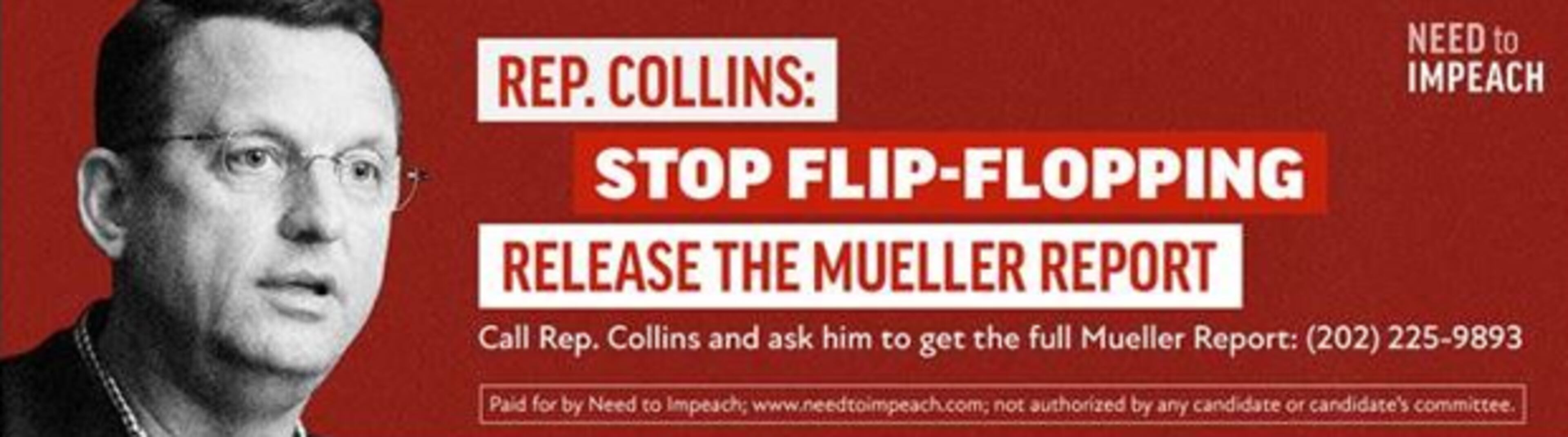 Speaking of Doug Collins and the Mueller probe, the progressive political group Need to Impeach is financing billboards and digital ads in the Republican's northeast Georgia congressional district urging him to "stop flip-flopping" and push for the release of the full report. Take a look for yourself: