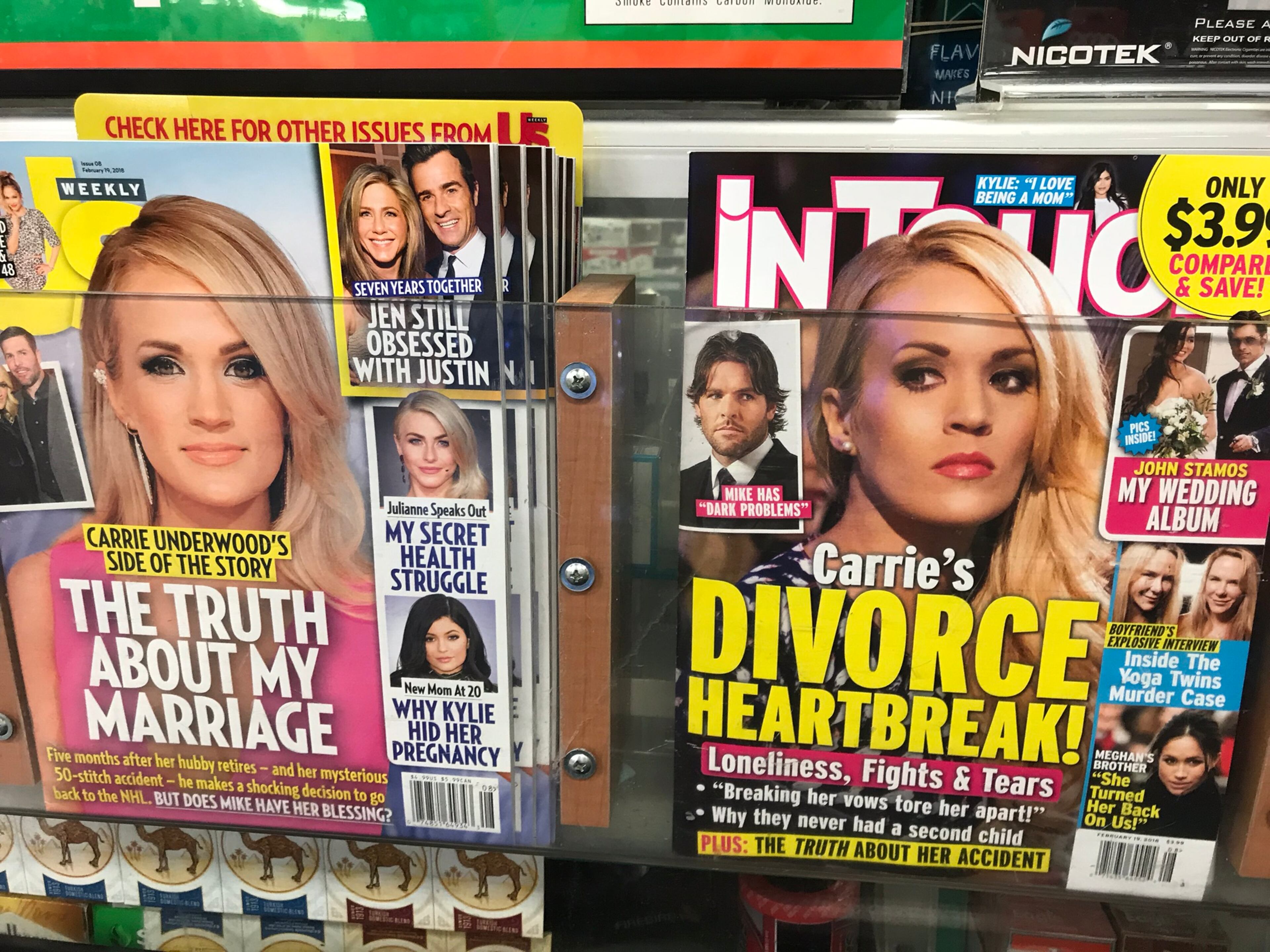 Carrie Underwood's recent injuries and her husband's return to hockey have fueled the tabloid magazines. She is typically not a controversial figure but the tabs clearly think she can sell copies. And aware of the rumors about her marriage, she went to US magazine to counter the other narrative as seen on InTouch.