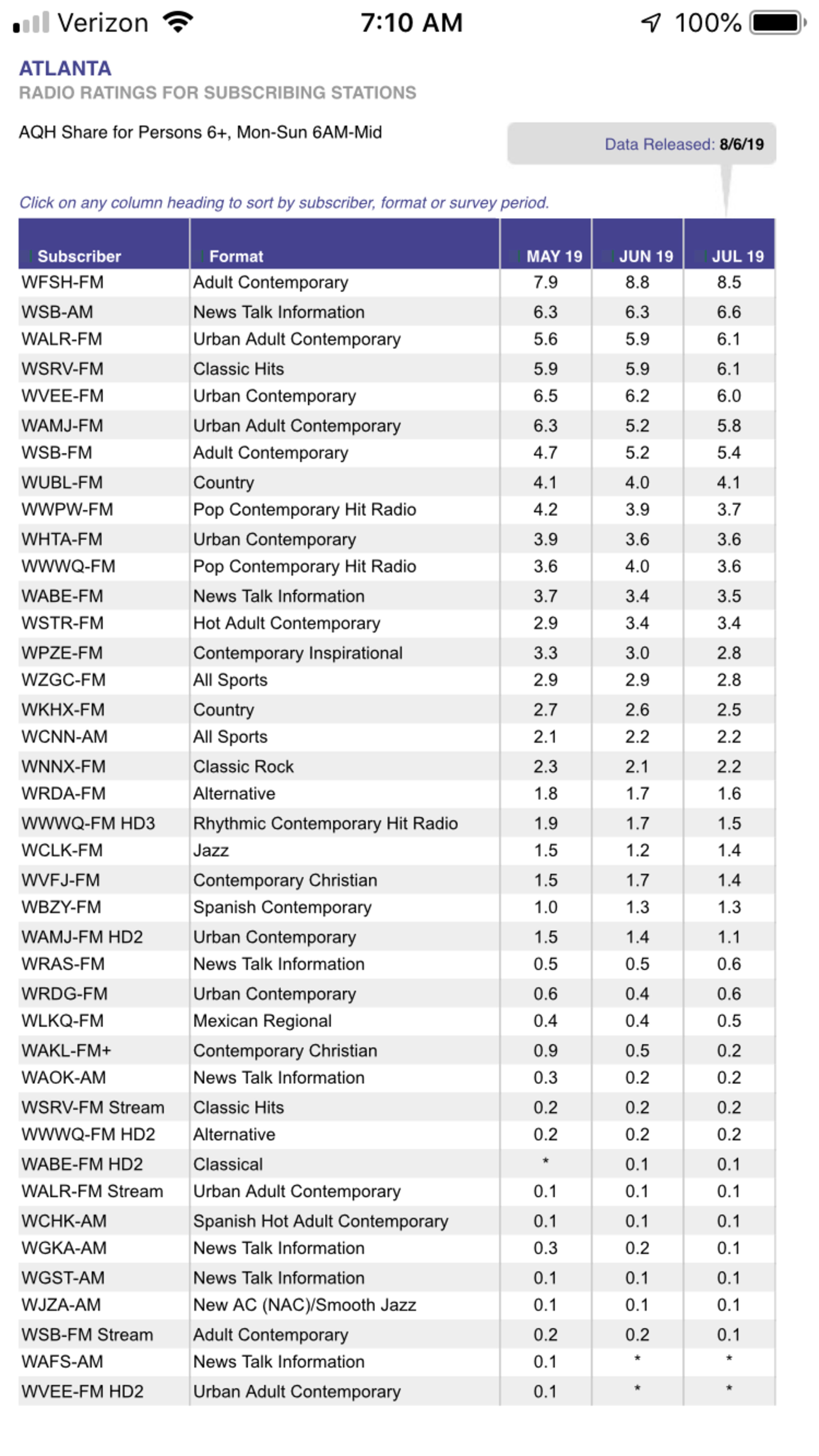 Not much changed between June and July ratings for Atlanta’s Nielsen Atlanta radio charts. (The latest ratings actually cover the four weeks between June 20 and July 17.)