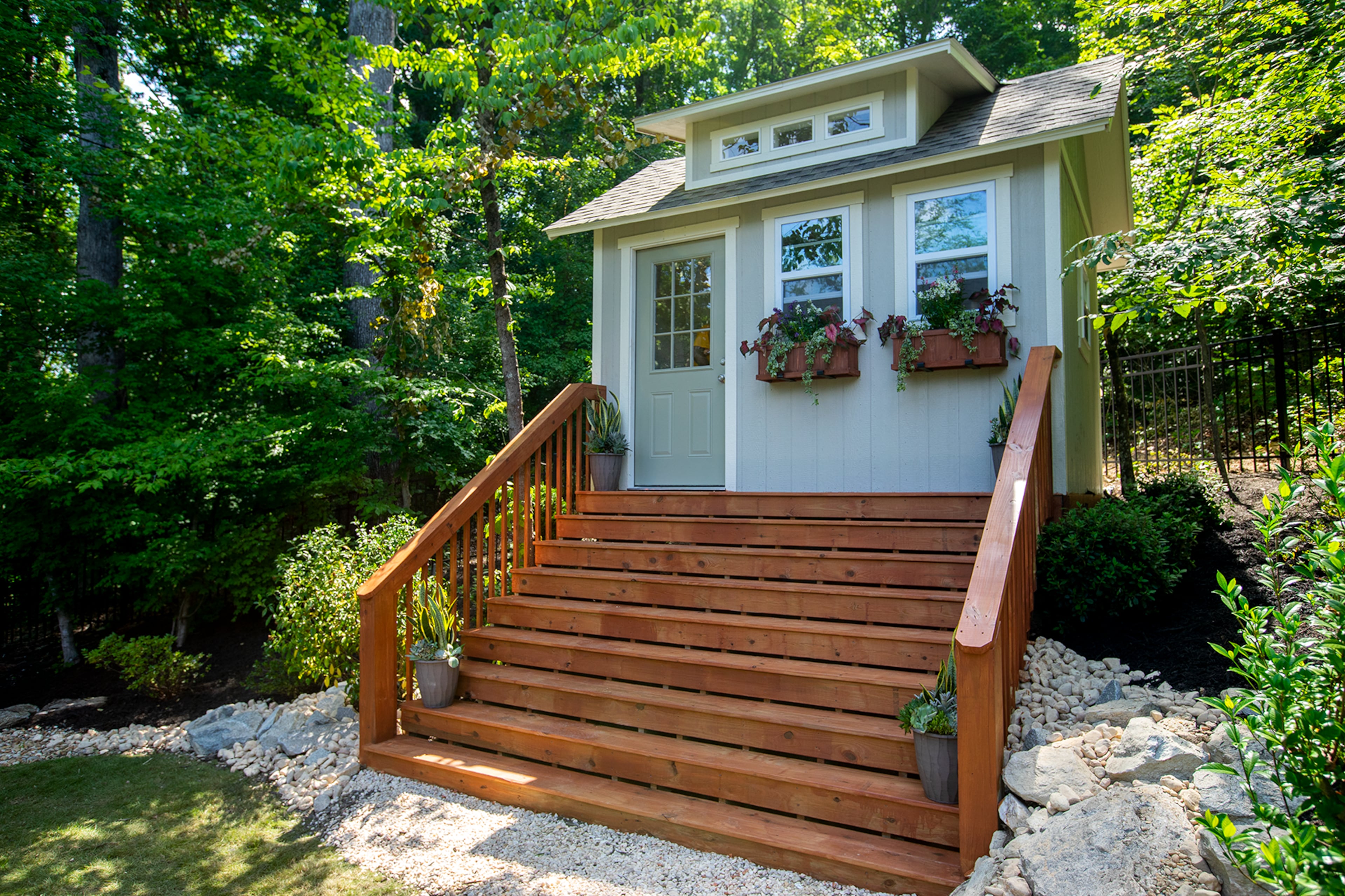 Her “tea” shed features weather proof, outdoor furniture. She has a nice porch front and bright colors on hers. There are multi-use spaces to drink tea and read or write. She can gaze out the window at nature or watch her kids play in the yard.