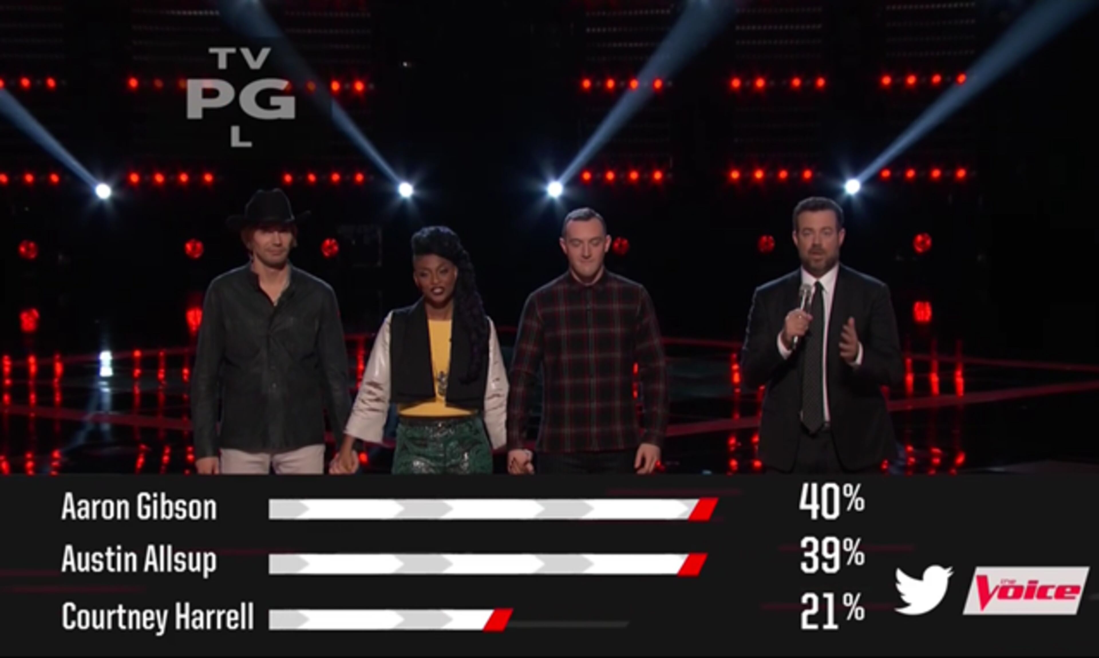 For the third week in a row, he survived "The Voice" Instant Save via Twitter, this time beating out two others. The latest victims: Courtney Harrell and Austin Allsup. This time, he barely won and for the first time, he defeated a guy.