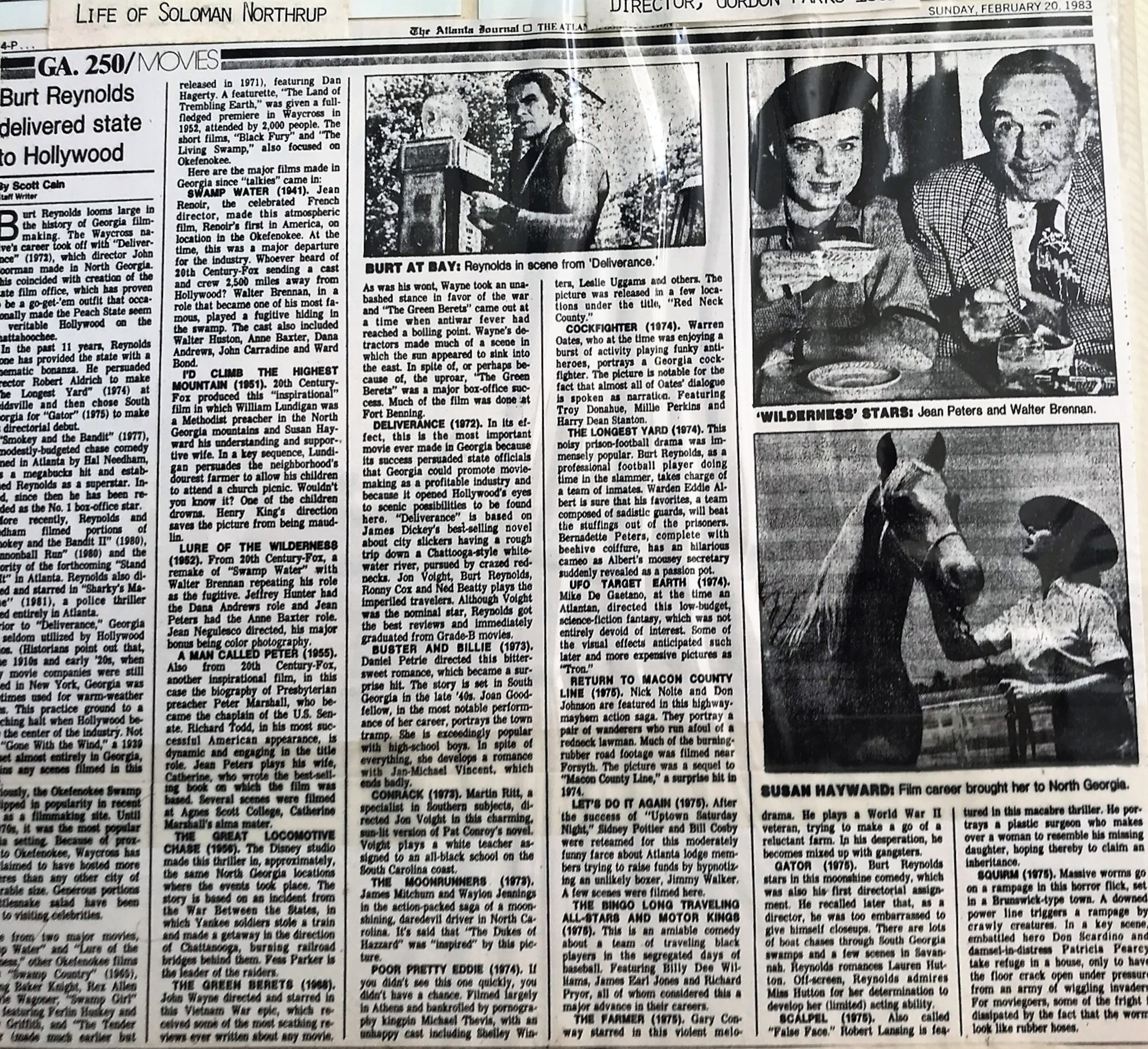 "Deliverance" (1972): This film convinced Spivia that Georgia could promote movie-making as a profitable industry and opened Hollywood's eyes to the scenic possibilities to be found here. It's based on James Dickey's best-selling novel about city slickers having a rough trip down the Chattooga River pursued by crazy redneck. (Cue "The Dueling Banjos"). Jon Voight, Burt Reynolds and Ned Beatty were among the stars. Reynolds met Spivia on set and they became life-long friends.