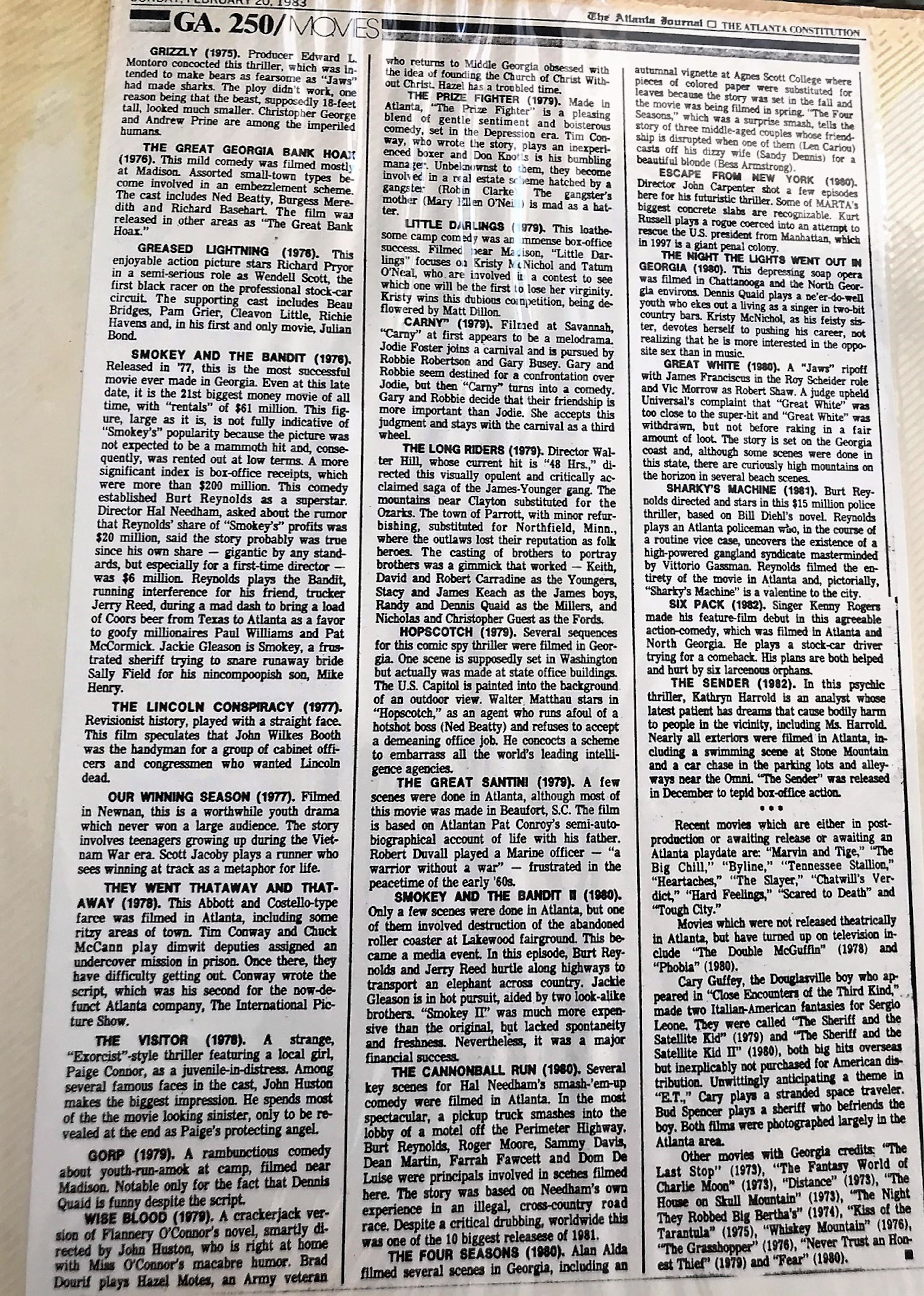 I took pictures of the articles and they are all available in the two photos below. They may be hard to read so below is a complete list of notables movies. There are also several movies just listed at the end with titles but no descriptives. The Georgia Film Office has a list of every production going back to 1972.