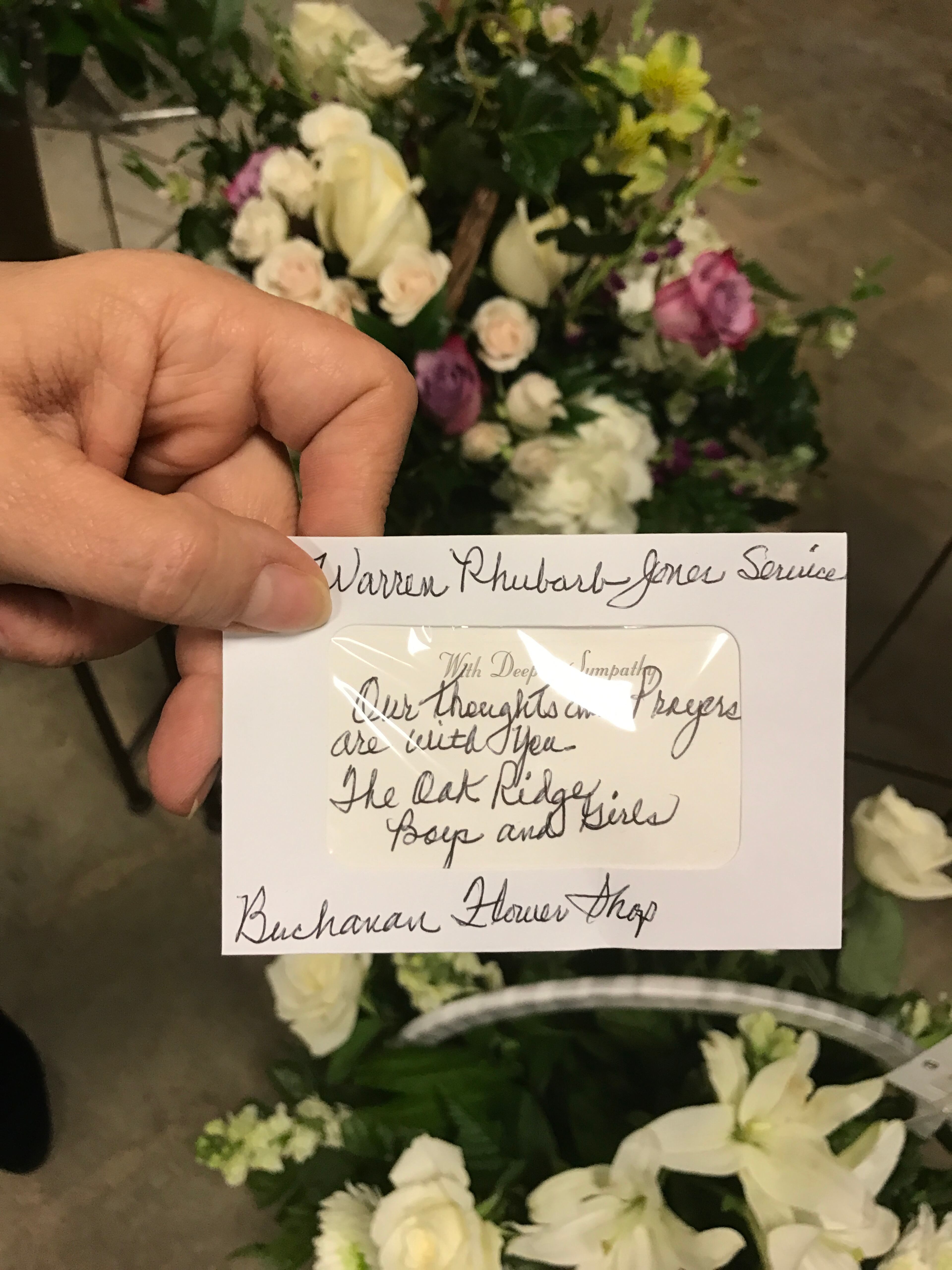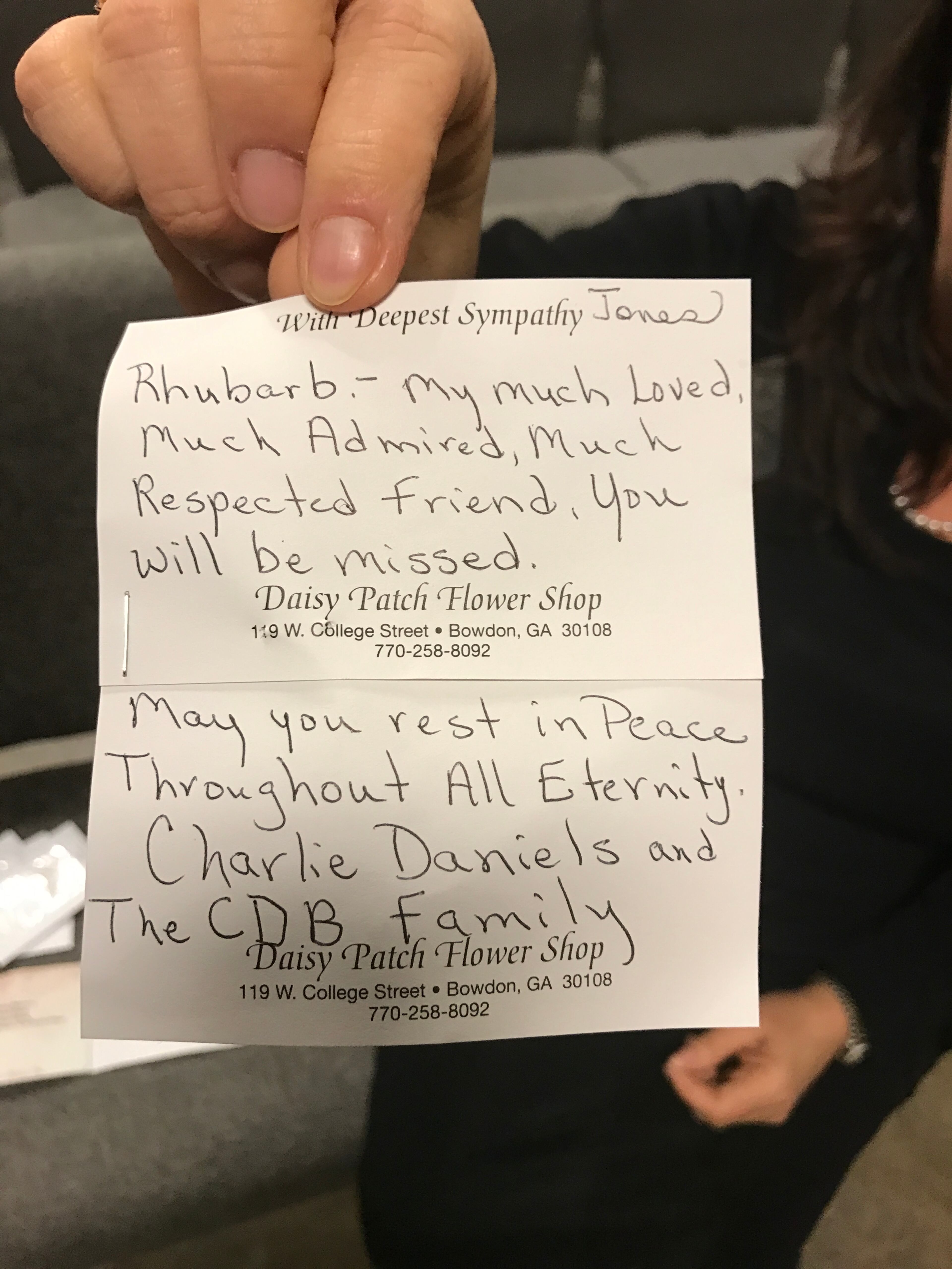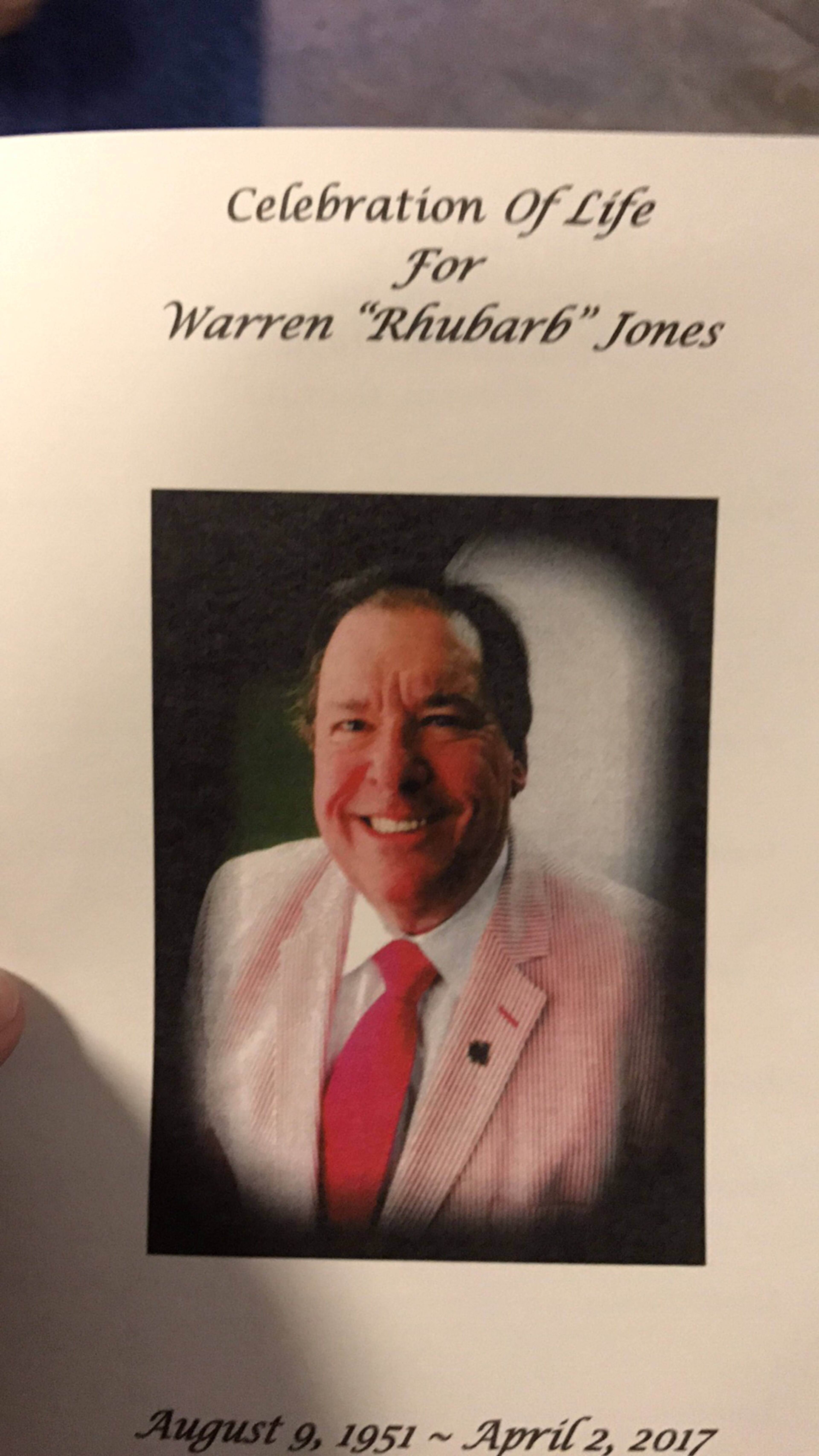 Several of his closest friends provided long, often rambling, tributes to the man they knew and loved, from his childhood up to just a few days earlier, 65 years of full livin'. Country artists T. Graham Brown and Shenandoah lead singer Marty Raybon sang gospel songs in his honor. His ol' rival Moby and many of his former radio station buddies showed up, along with much of Tallapoosa's finest. Dozens of flower arrangements lined the front of the stage from all parts of his life, including the country music world, with Travis Tritt, Charlie Daniels and the Oak Ridge Boys sending regards.