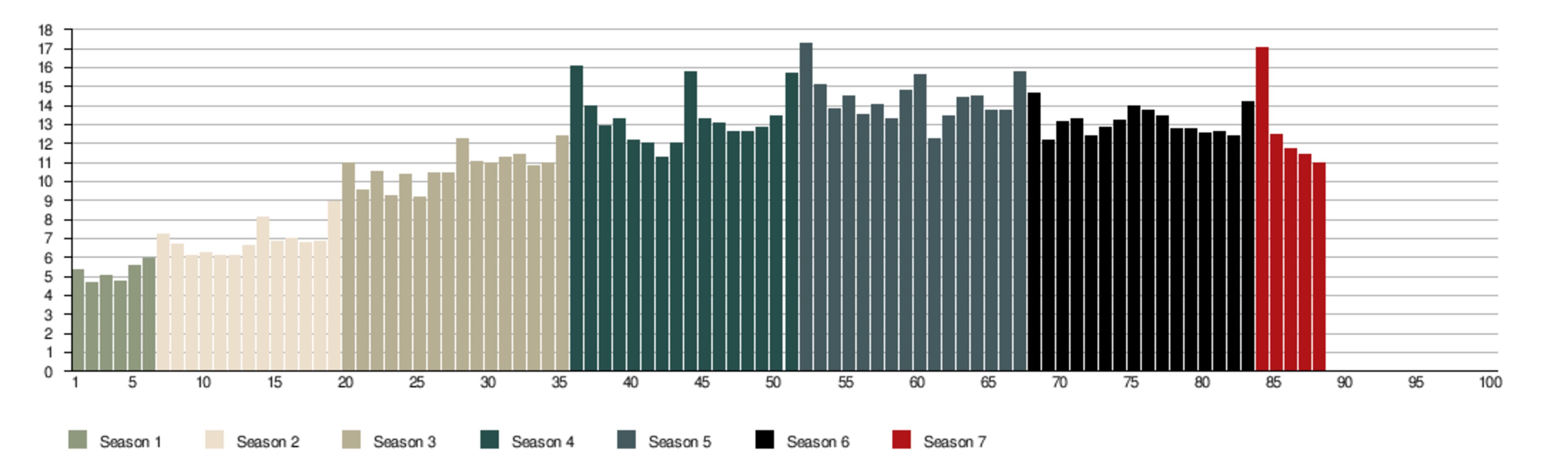 A year ago, the show opened at 14.63 million and was only down 15 percent from episodes one to five. In 2014, the five episode drop-off was 22 percent; during season four, it was 24 percent.