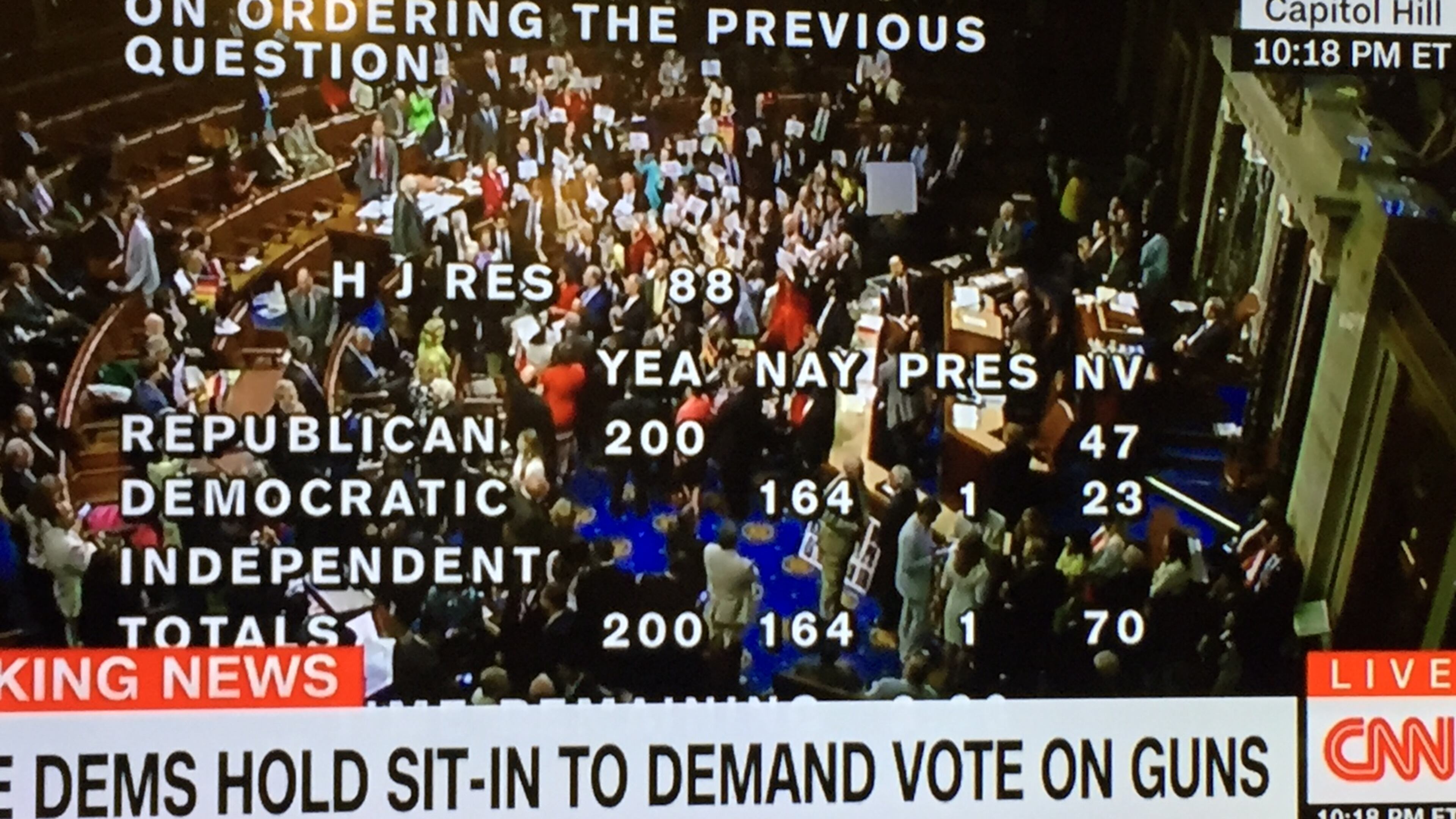 The Democrats dubbed the protest a "sit in," echoing civil rights efforts decades earlier that Lewis had taken part. It began around 11:25 a.m. and was still going at 10:54 p.m. EST. "No bills, no break!" was the mantra. They demanded a vote on various gun control bills.