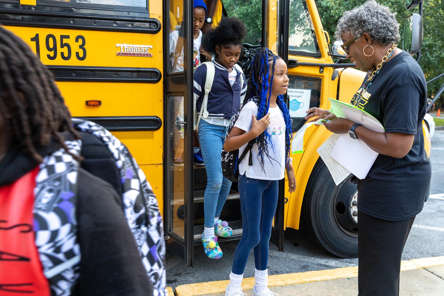 On the first day of school in DeKalb County, cheerleaders, retired players and the mascot for the Atlanta Falcons greeted students as they arrived at Stoneview Elementary School. Photos from The Atlanta Journal-Constitution