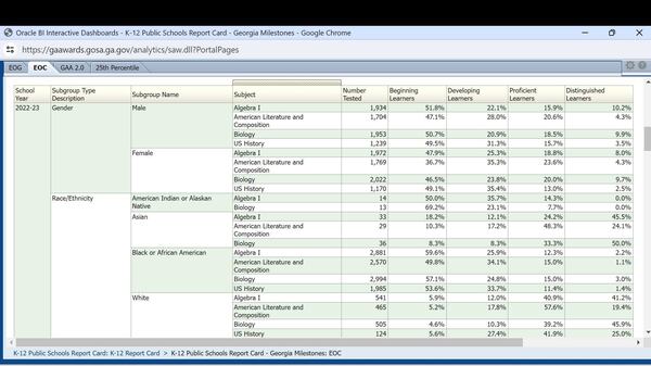 • The state’s Report Card — available through the Governor’s Office of Student Achievement — shows a stubborn and wide achievement gap in the performance of Black students, who comprise 71% of enrollment in Atlanta, and white students, who account for 16%. For example, in 2022-23, only 3% of Black students scored high enough on the state end-of-grade mathematics test to qualify as distinguished learners, compared to 40.7% of white students and nearly 48% of Asian students. The gap worsens in high school, where only 2.2% of Black students in Algebra 1 earned distinguished learner status in APS, compared to 41.2% of white classmates and 45.5% of Asian classmates.