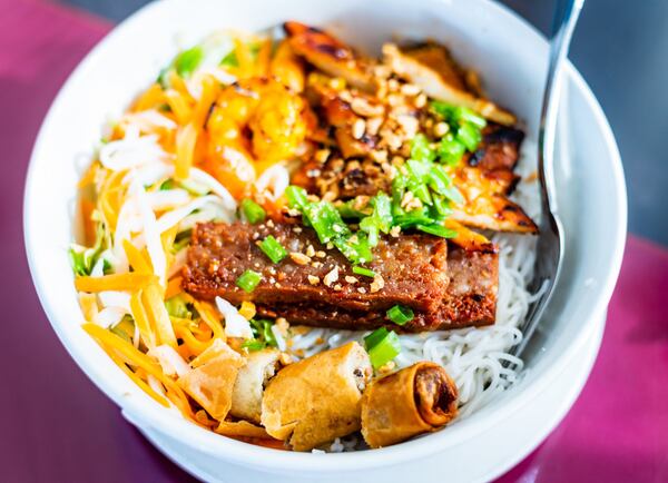 People tend to go to Vietnamese restaurants for a hot bowl of pho, but my order always is a bun dish. Bun is a classic cold noodle dish made up of thin rice vermicelli that serves as a vehicle for a myriad of toppings, from seafood to pork. Many bun dishes come with a shower of shredded lettuce, bean sprouts, cucumbers, cilantro, and a spicy-sweet sauce typical to Vietnam, called nuoc cham. The bun dac biet at Nam Phuong features grilled shrimp, beef, pork and a fried spring roll chopped in half. Toss it all with the sauce, and maybe something from the condiment caddies.