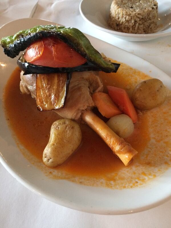 But we had waited patiently for it — there had been a communication breakdown between server and kitchen — and there it was: a beautiful lollipop of a lamb shin, sitting in a delicate slick of tomato-and-olive-oil-kissed braising liquid, chunks of carrot and a few well-scrubbed small potatoes scattered around. An over-the-top stack of charry veggies — thin slices of eggplant, half a plum tomato, a long, curly-toed green pepper — was deftly balanced on the hunk of meat with a skinny wooden skewer.