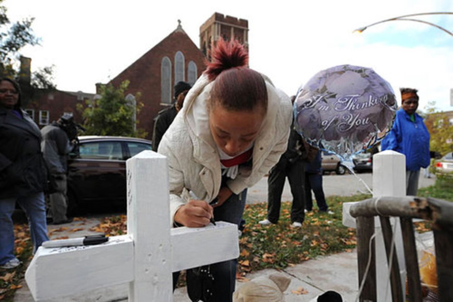 An unidentified member of the Hudson family reacts to the huge amount of flowers, stuffed animals and balloons as she arrives to retrieve items from the family home Oct. 28, 2008. The body of Julian King, Jennifer Hudson's nephew, was found Monday slumped in the back seat of a Chevrolet Suburban, about 72 hours after a gunman killed his grandmother and uncle.