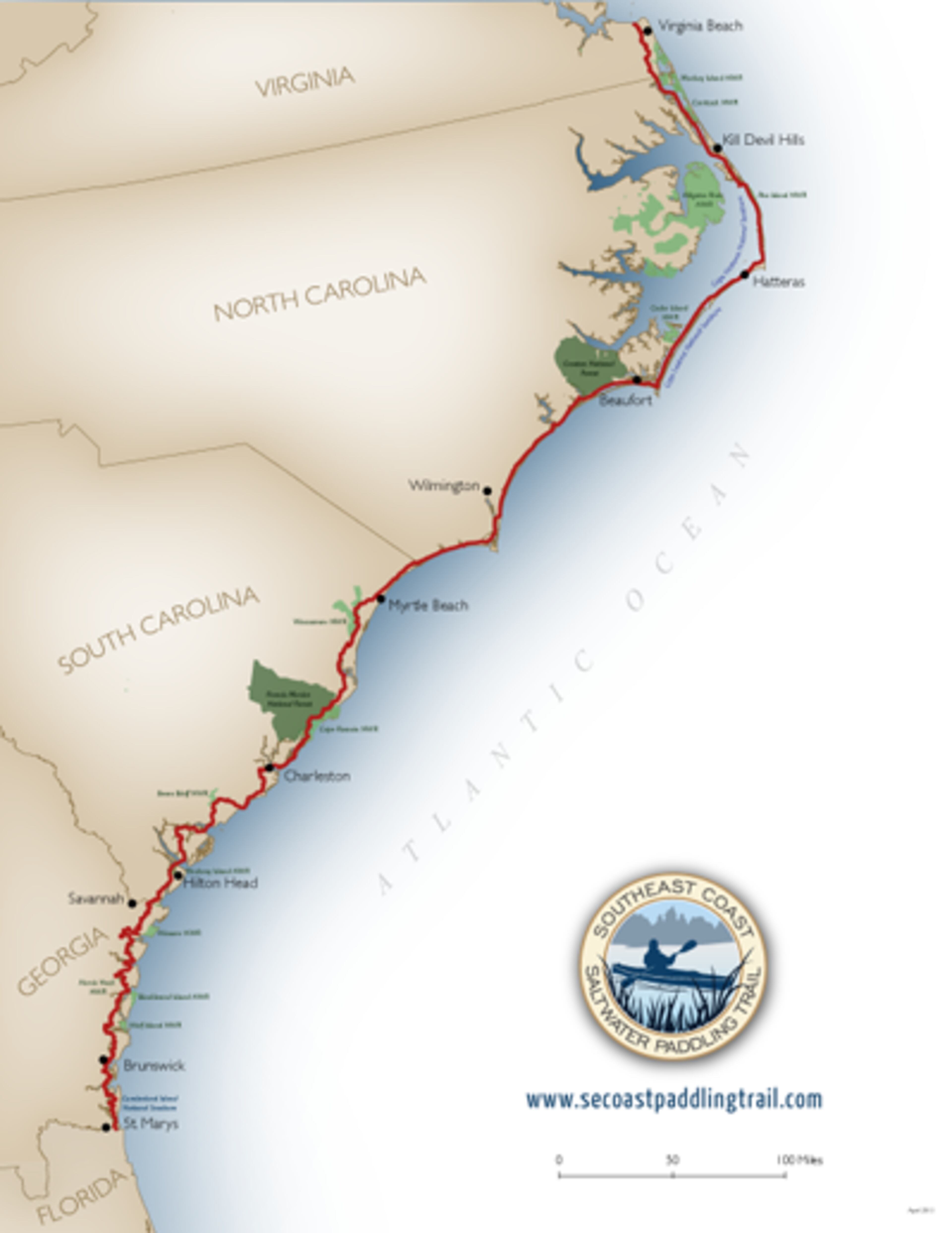 The Southeast Coast Saltwater Paddling Trail connects the Chesapeake Bay and the Georgia-Florida border. For more than 800 miles, the SECT hugs the coastal waters of Virginia, North Carolina, South Carolina and Georgia, providing an unbroken trail through four states in the tidal marshes and rivers of the Southeast.